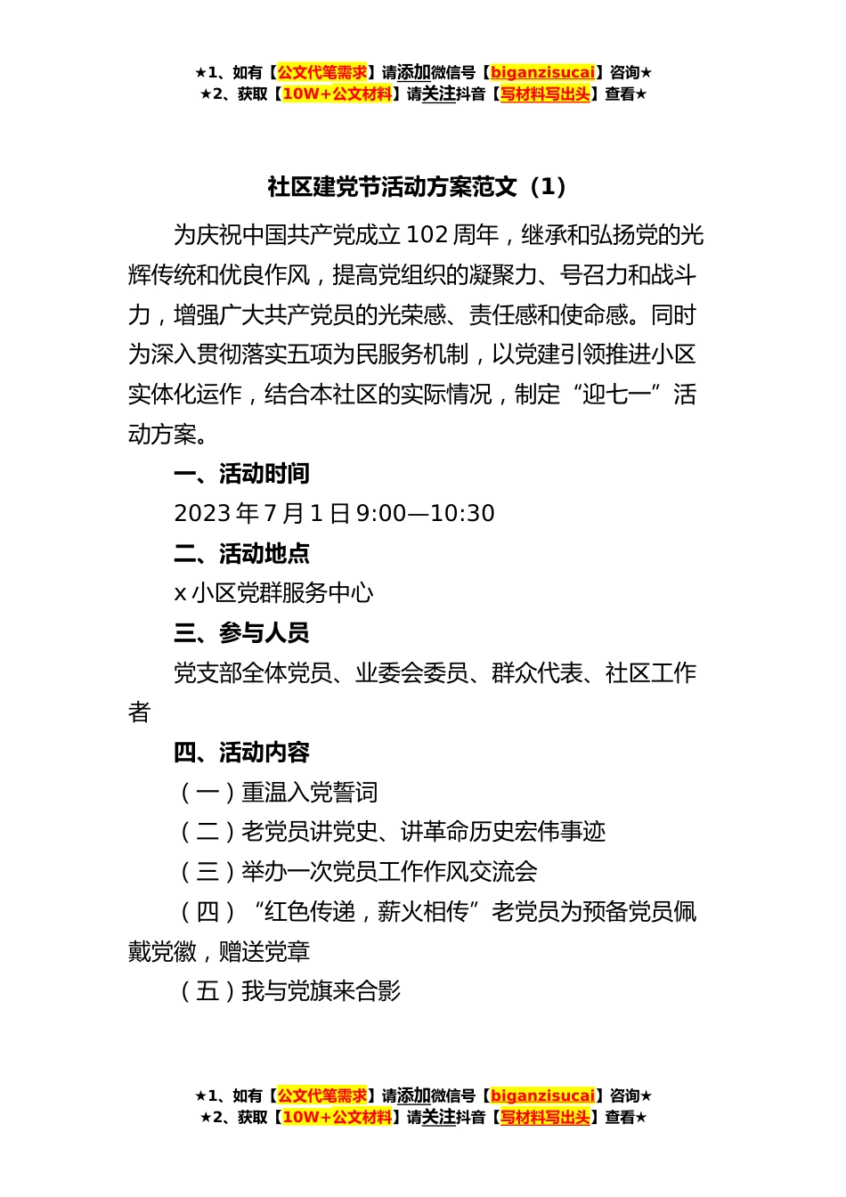★1、如有【公文代笔需求】请添加微信号【biganzisucai】咨询★★2、获取【10W+公文材料】请关注抖音【写材料写出头】查看★社区建党节活动方案范文(1)为庆祝中国共产党成立102周年,继承和弘扬党的光辉传统和优良作风,提高党组织的凝聚力、号召力和战斗力,增强广大共产党员的光荣感、责任感和使命感。同时为深入贯彻落实五项为民服务机制,以党建引领推进小区实体化运作,结合本社区的实际情况,制定“迎七一”活动方案。一、活动时间2023年7月1日9:00—10:30二、活动地点x小区党群服务中心三、参与人员党支部全体党员、业委会委员、群众代表、社区工作者四、活动内容(一)重温入党誓词(二)老党员讲党史、讲革命历史宏伟事迹(三)举办一次党员工作作风交流会(四)“红色传递,薪火相传”老党员为预备党...