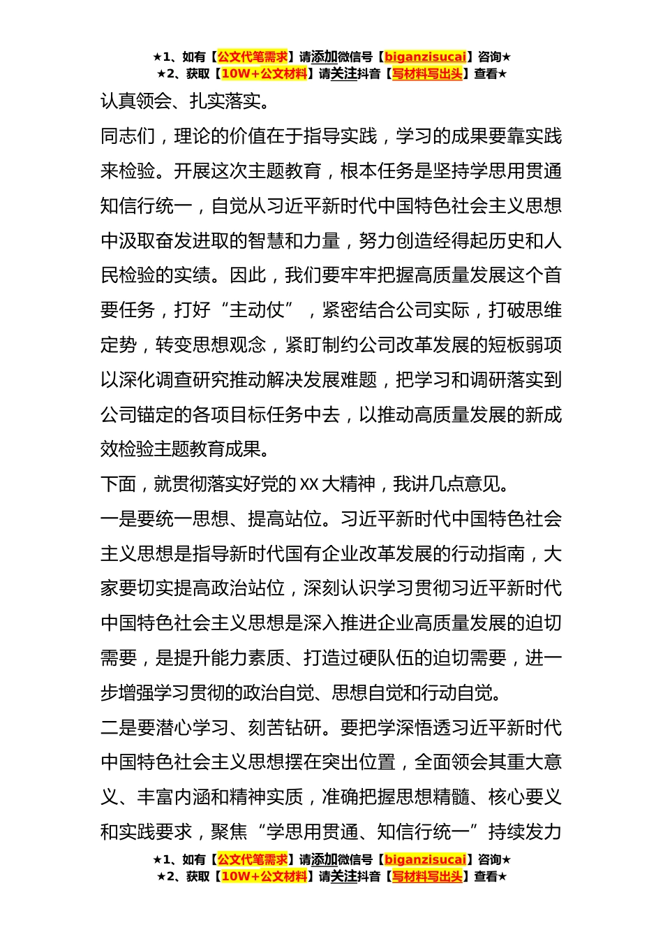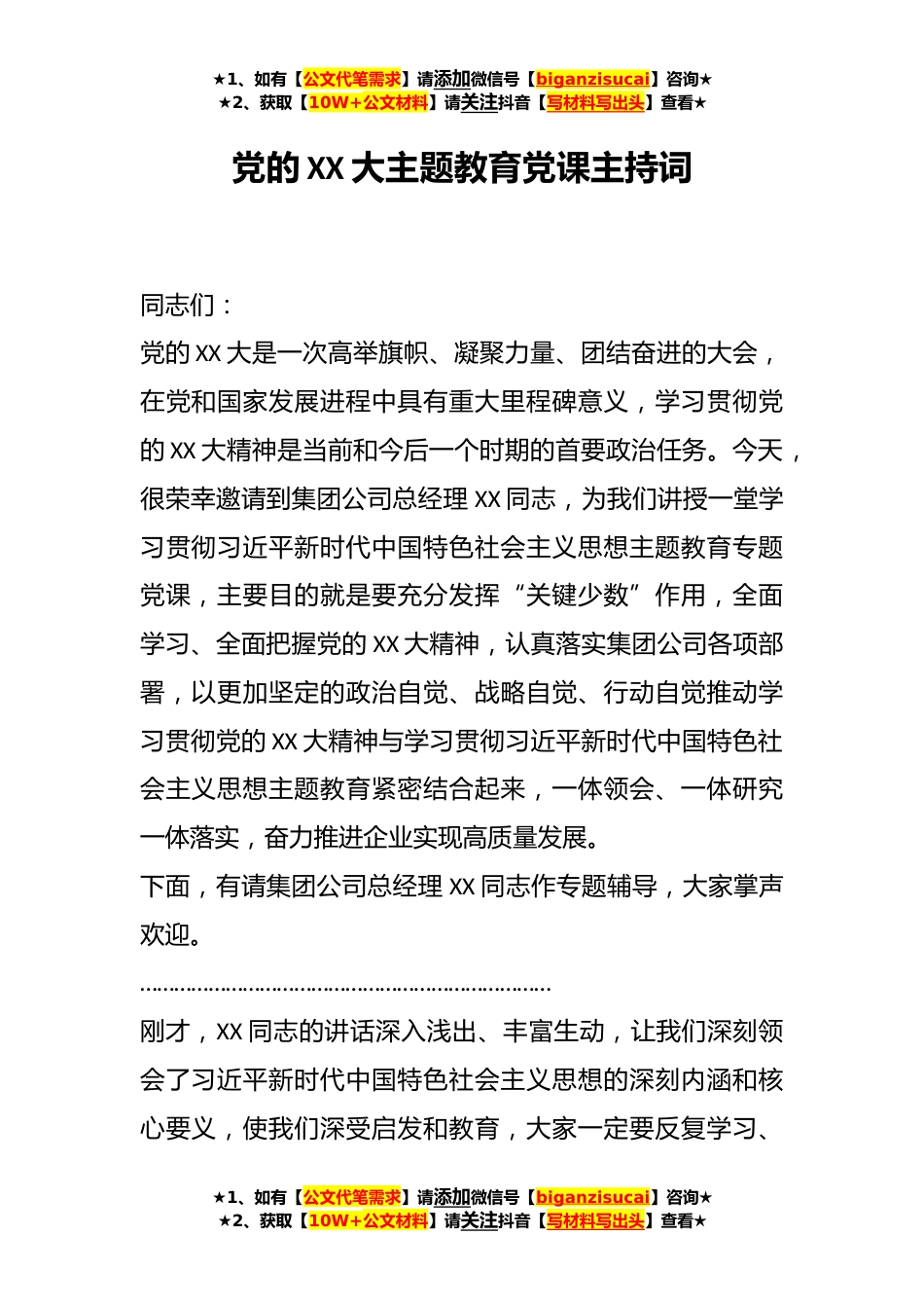 ★1、如有【公文代笔需求】请添加微信号【biganzisucai】咨询★★2、获取【10W+公文材料】请关注抖音【写材料写出头】查看★党的XX大主题教育党课主持词同志们:党的XX大是一次高举旗帜、凝聚力量、团结奋进的大会,在党和国家发展进程中具有重大里程碑意义,学习贯彻党的XX大精神是当前和今后一个时期的首要政治任务。今天,很荣幸邀请到集团公司总经理XX同志,为我们讲授一堂学习贯彻习近平新时代中国特色社会主义思想主题教育专题党课,主要目的就是要充分发挥“关键少数”作用,全面学习、全面把握党的XX大精神,认真落实集团公司各项部署,以更加坚定的政治自觉、战略自觉、行动自觉推动学习贯彻党的XX大精神与学习贯彻习近平新时代中国特色社会主义思想主题教育紧密结合起来,一体领会、一体研究一体落实,...