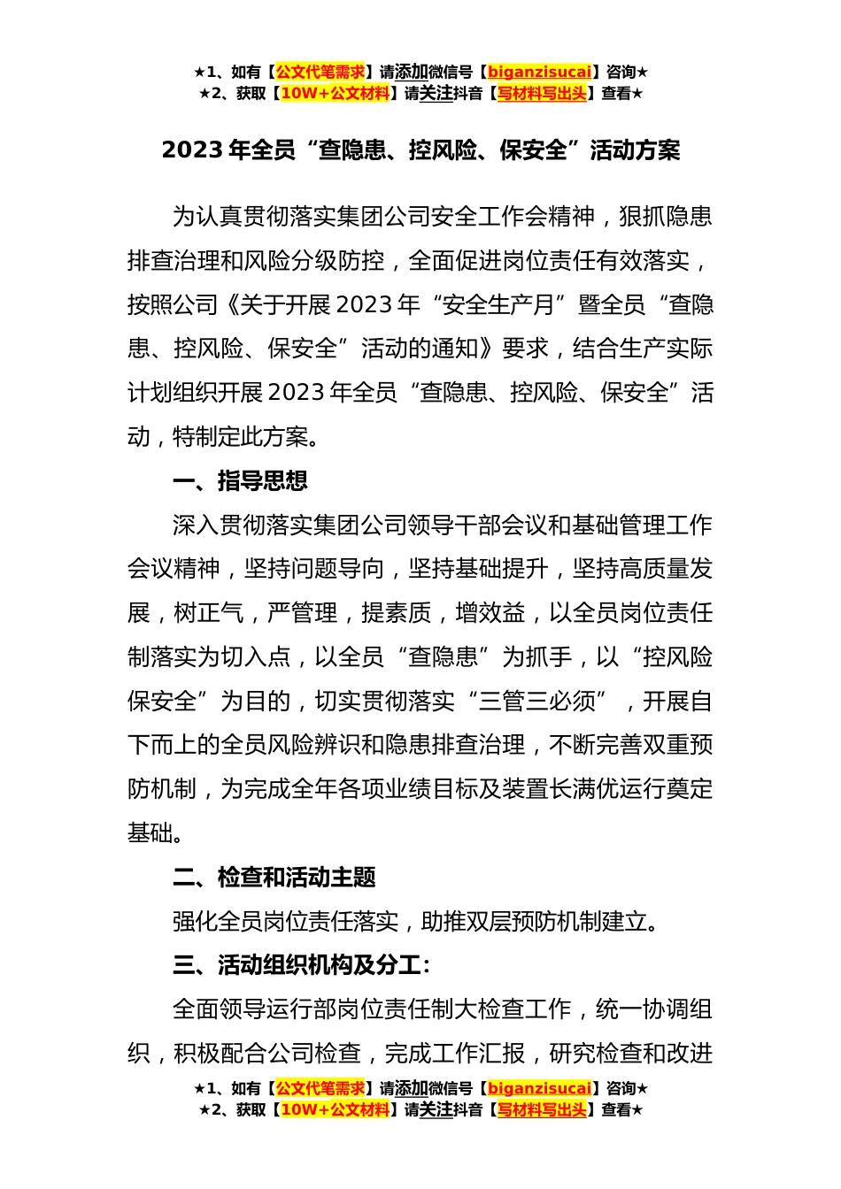 ★1、如有【公文代笔需求】请添加微信号【biganzisucai】咨询★★2、获取【10W+公文材料】请关注抖音【写材料写出头】查看★2023年全员“查隐患、控风险、保安全”活动方案为认真贯彻落实集团公司安全工作会精神,狠抓隐患排查治理和风险分级防控,全面促进岗位责任有效落实,按照公司《关于开展2023年“安全生产月”暨全员“查隐患、控风险、保安全”活动的通知》要求,结合生产实际计划组织开展2023年全员“查隐患、控风险、保安全”活动,特制定此方案。一、指导思想深入贯彻落实集团公司领导干部会议和基础管理工作会议精神,坚持问题导向,坚持基础提升,坚持高质量发展,树正气,严管理,提素质,增效益,以全员岗位责任制落实为切入点,以全员“查隐患”为抓手,以“控风险保安全”为目的,切实贯彻落实“...