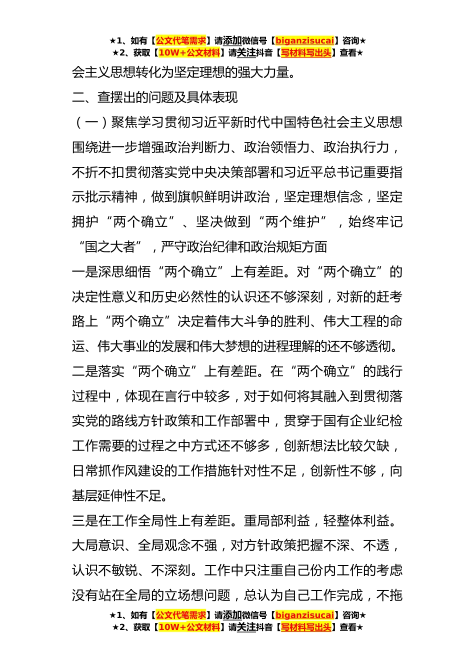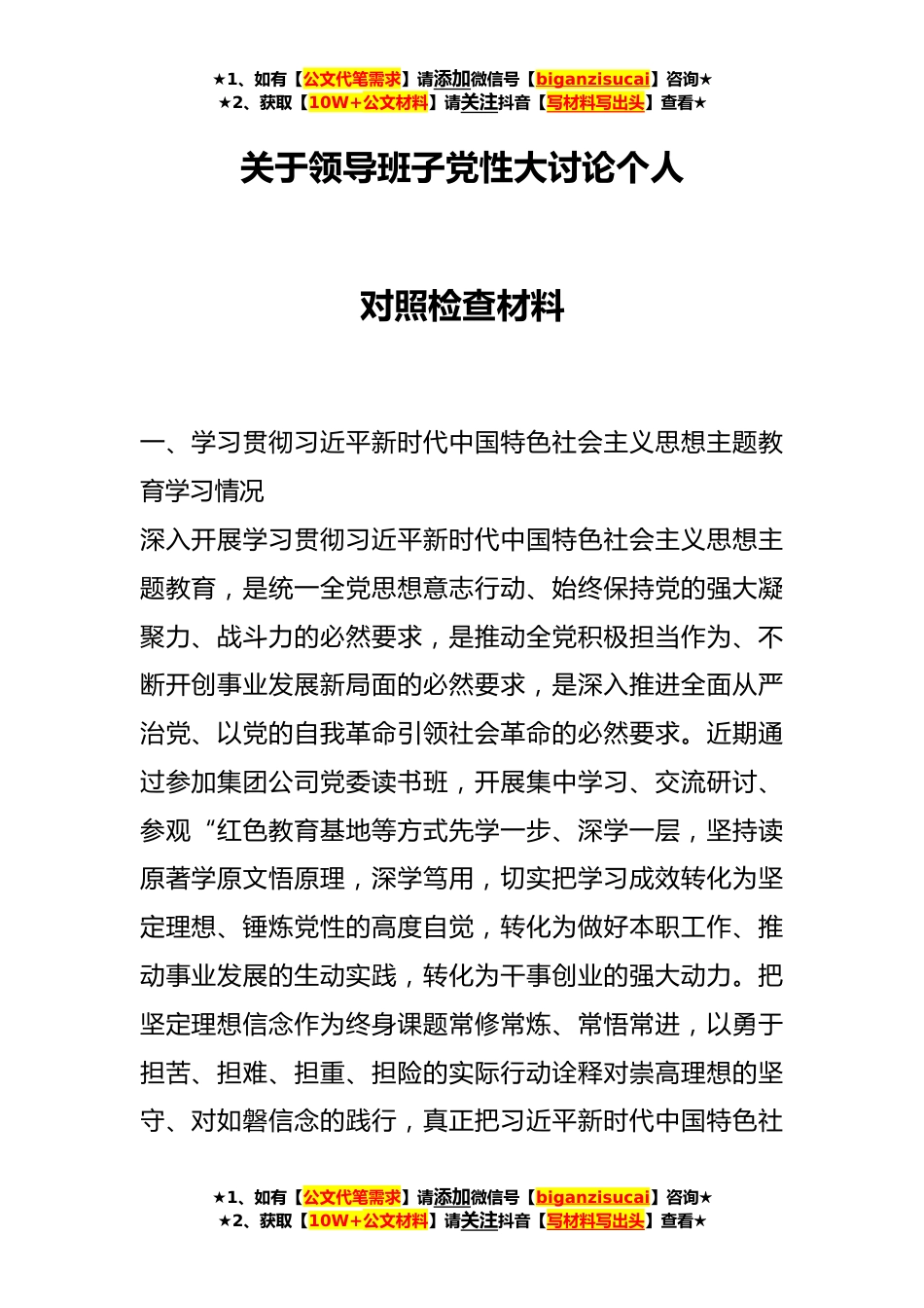 ★1、如有【公文代笔需求】请添加微信号【biganzisucai】咨询★★2、获取【10W+公文材料】请关注抖音【写材料写出头】查看★关于领导班子党性大讨论个人对照检查材料一、学习贯彻习近平新时代中国特色社会主义思想主题教育学习情况深入开展学习贯彻习近平新时代中国特色社会主义思想主题教育,是统一全党思想意志行动、始终保持党的强大凝聚力、战斗力的必然要求,是推动全党积极担当作为、不断开创事业发展新局面的必然要求,是深入推进全面从严治党、以党的自我革命引领社会革命的必然要求。近期通过参加集团公司党委读书班,开展集中学习、交流研讨、参观“红色教育基地等方式先学一步、深学一层,坚持读原著学原文悟原理,深学笃用,切实把学习成效转化为坚定理想、锤炼党性的高度自觉,转化为做好本职工作、...
