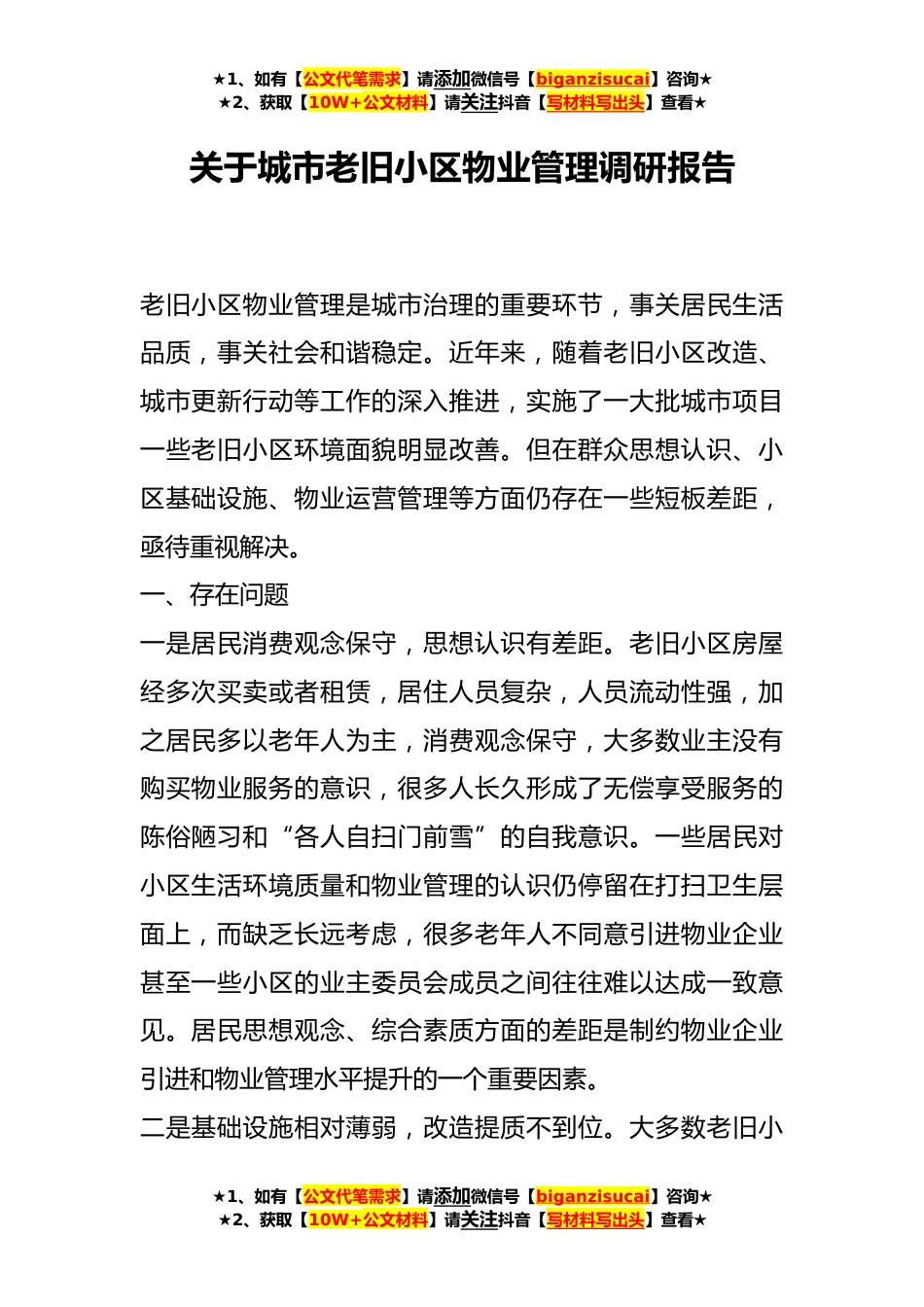 ★1、如有【公文代笔需求】请添加微信号【biganzisucai】咨询★★2、获取【10W+公文材料】请关注抖音【写材料写出头】查看★关于城市老旧小区物业管理调研报告老旧小区物业管理是城市治理的重要环节,事关居民生活品质,事关社会和谐稳定。近年来,随着老旧小区改造、城市更新行动等工作的深入推进,实施了一大批城市项目一些老旧小区环境面貌明显改善。但在群众思想认识、小区基础设施、物业运营管理等方面仍存在一些短板差距,亟待重视解决。一、存在问题一是居民消费观念保守,思想认识有差距。老旧小区房屋经多次买卖或者租赁,居住人员复杂,人员流动性强,加之居民多以老年人为主,消费观念保守,大多数业主没有购买物业服务的意识,很多人长久形成了无偿享受服务的陈俗陋习和“各人自扫门前雪”的自我意识...