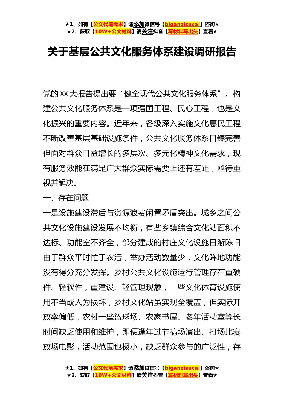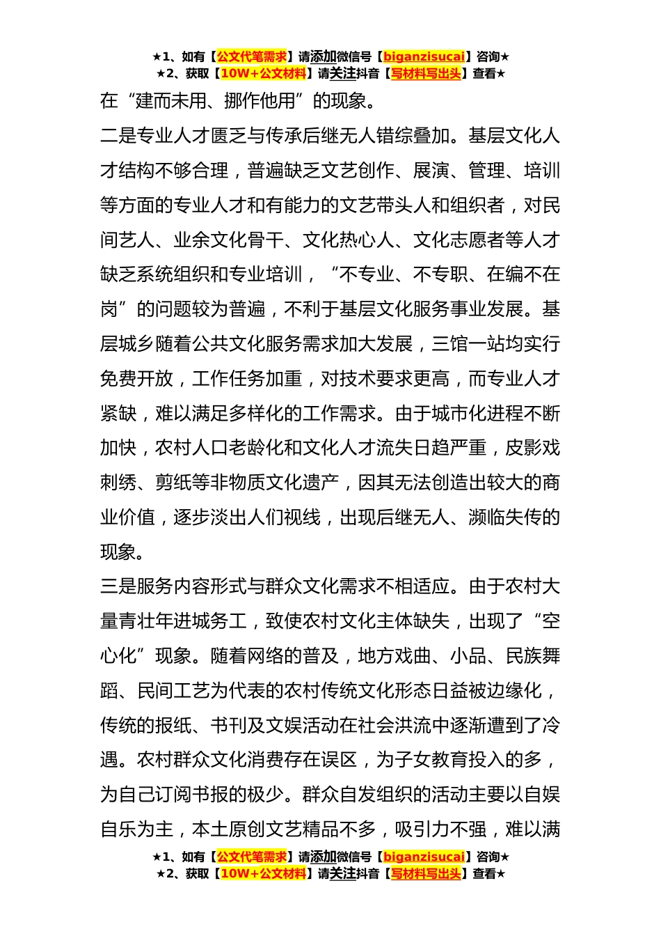 ★1、如有【公文代笔需求】请添加微信号【biganzisucai】咨询★★2、获取【10W+公文材料】请关注抖音【写材料写出头】查看★关于基层公共文化服务体系建设调研报告党的XX大报告提出要“健全现代公共文化服务体系”。构建公共文化服务体系是一项强国工程、民心工程,也是文化振兴的重要内容。近年来,各级深入实施文化惠民工程不断改善基层基础设施条件,公共文化服务体系日臻完善但面对群众日益增长的多层次、多元化精神文化需求,现有服务效能在满足广大群众实际需要上还有差距,亟待重视并解决。一、存在问题一是设施建设滞后与资源浪费闲置矛盾突出。城乡之间公共文化设施建设发展不均衡,有些乡镇综合文化站面积不达标、功能室不齐全,部分建成的村庄文化设施日渐陈旧由于群众平时忙于农活,举办活动数量少,...