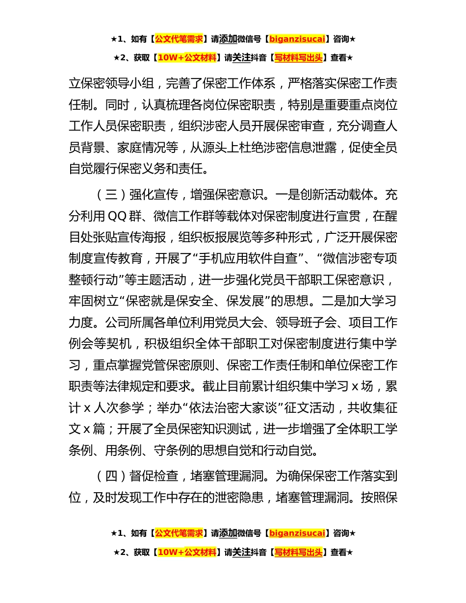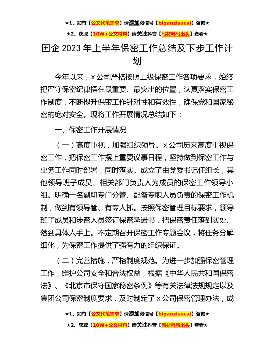 ★1、如有【公文代笔需求】请添加微信号【biganzisucai】咨询★★2、获取【10W+公文材料】请关注抖音【写材料写出头】查看★国企2023年上半年保密工作总结及下步工作计划今年以来,x公司严格按照上级保密工作各项要求,始终把严守保密纪律摆在最重要、最突出的位置,认真落实保密工作制度,不断提升保密工作针对性和有效性,确保党和国家秘密的绝对安全。现将工作开展情况总结如下:一、保密工作开展情况(一)高度重视,加强组织领导。x公司历来高度重视保密工作,把保密工作摆上重要议事日程,坚持做到保密工作与业务工作同时部署,同时落实。成立了由党委书记任组长,其他领导班子成员、相关部门负责人为成员的保密工作领导小组。明确一名副职专门分管、配备专职人员负责的保密工作机制,做到有领导管、有专人...