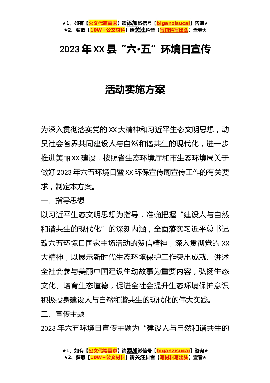 ★1、如有【公文代笔需求】请添加微信号【biganzisucai】咨询★★2、获取【10W+公文材料】请关注抖音【写材料写出头】查看★2023年XX县“六•五”环境日宣传活动实施方案为深入贯彻落实党的XX大精神和习近平生态文明思想,动员社会各界共同建设人与自然和谐共生的现代化,进一步推进美丽XX建设,按照省生态环境厅和市生态环境局关于做好2023年六五环境日暨XX环保宣传周宣传工作的有关要求,制定本方案。一、指导思想以习近平生态文明思想为指导,准确把握“建设人与自然和谐共生的现代化”的深刻内涵,全面落实习近平总书记致六五环境日国家主场活动的贺信精神,深入贯彻党的XX大精神,以展示新时代生态环境保护工作突出成就、讲述全社会参与美丽中国建设生动故事为重要内容,弘扬生态文化、培育生态道德,促进全...