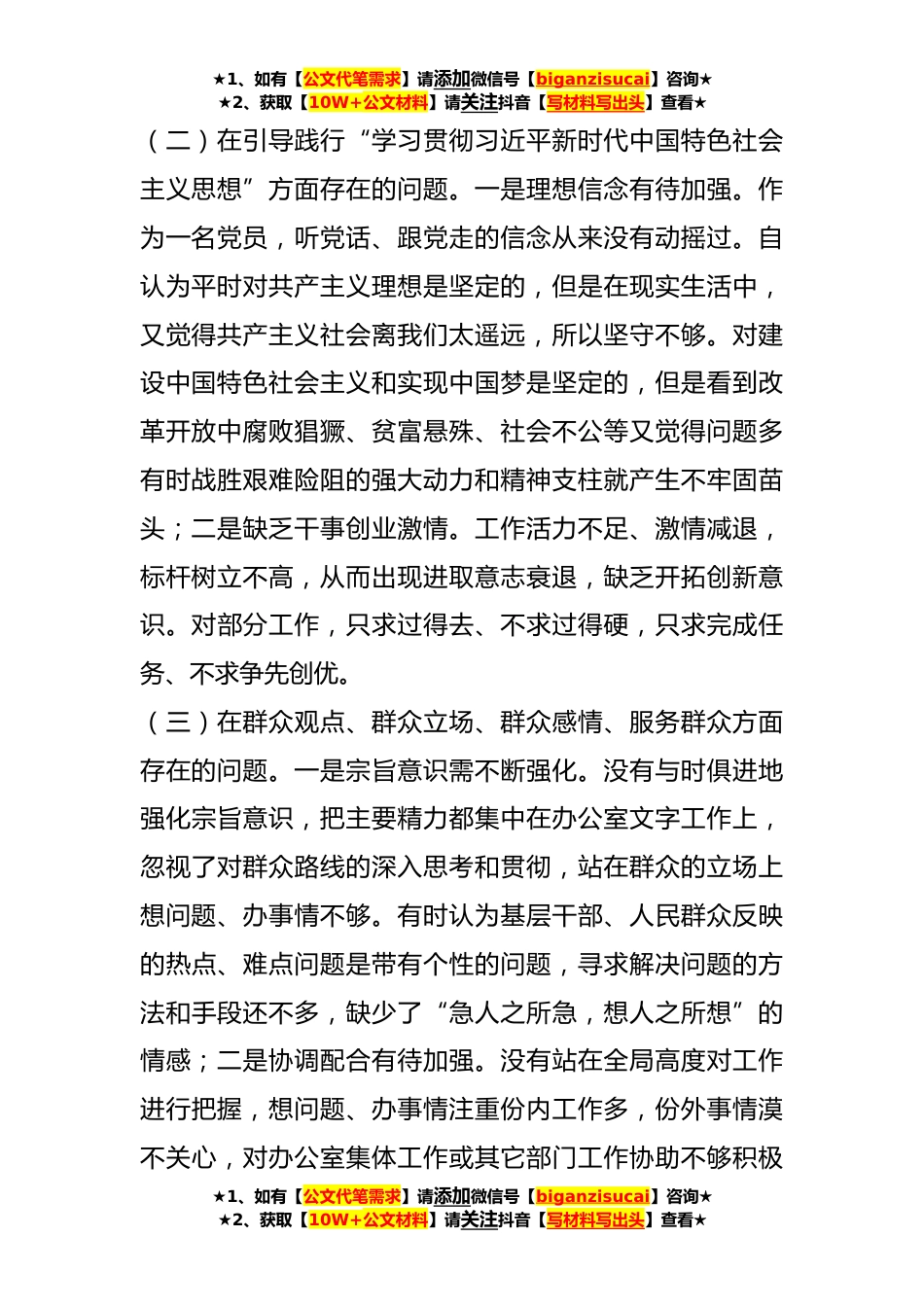 ★1、如有【公文代笔需求】请添加微信号【biganzisucai】咨询★★2、获取【10W+公文材料】请关注抖音【写材料写出头】查看★2023年学习贯彻主题教育民主生活会个人对照检查材料根据团市委“学习贯彻习近平新时代中国特色社会主义思想”主题教育检视问题工作方案要求,我深刻查找自身突出问题,深入剖析问题产生根源,提出了整改方向和措施现作以对照检查,敬请组织和各位同志提出批评意见。一、坚持问题导向,深入查摆自身不足(一)在增强“四个意识”、坚定“四个自信”、做到“两个维护”方面存在的问题。一是理论学习不经常。在日常工作中降低了自主学习意识,日常学习不能做到持之以恒、常抓不懈。特别是对一些新理论、新知识,一般通读多、重点精读少,韧性钻劲不足,有浅尝辄止现象。面对当前出现的新情况...