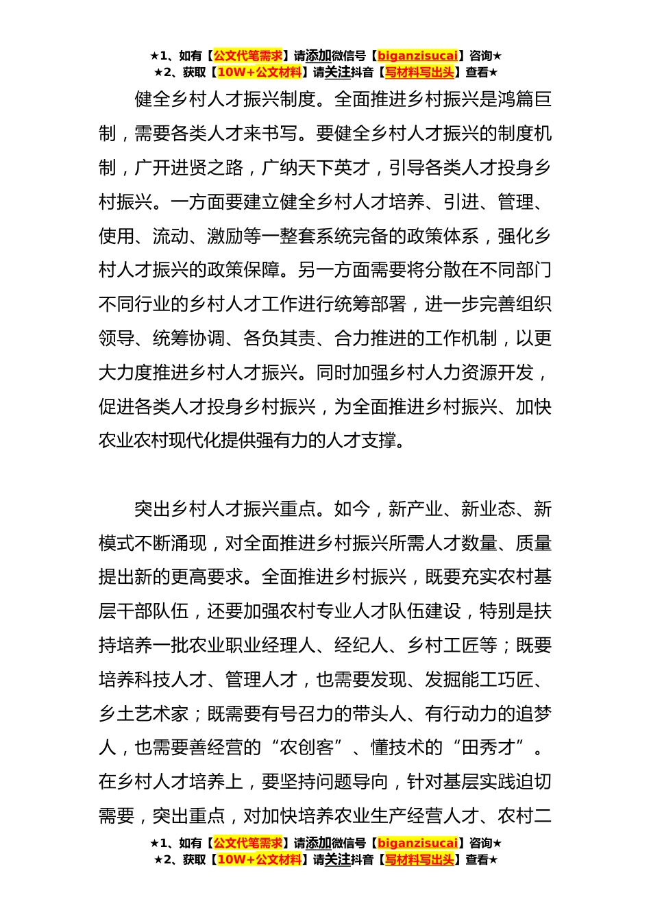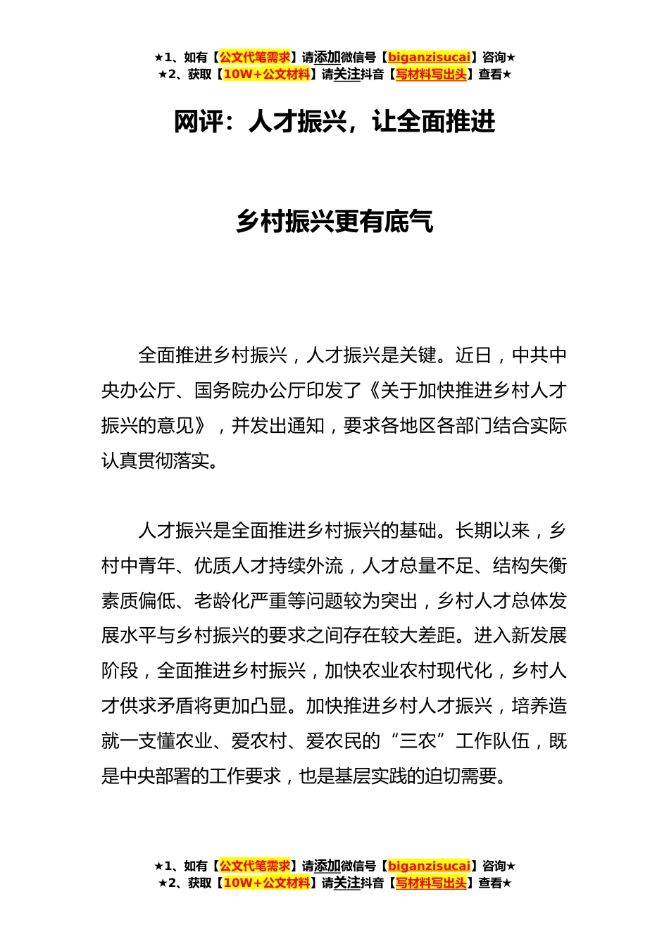★1、如有【公文代笔需求】请添加微信号【biganzisucai】咨询★★2、获取【10W+公文材料】请关注抖音【写材料写出头】查看★网评:人才振兴,让全面推进乡村振兴更有底气全面推进乡村振兴,人才振兴是关键。近日,中共中央办公厅、国务院办公厅印发了《关于加快推进乡村人才振兴的意见》,并发出通知,要求各地区各部门结合实际认真贯彻落实。人才振兴是全面推进乡村振兴的基础。长期以来,乡村中青年、优质人才持续外流,人才总量不足、结构失衡素质偏低、老龄化严重等问题较为突出,乡村人才总体发展水平与乡村振兴的要求之间存在较大差距。进入新发展阶段,全面推进乡村振兴,加快农业农村现代化,乡村人才供求矛盾将更加凸显。加快推进乡村人才振兴,培养造就一支懂农业、爱农村、爱农民的“三农”工作队伍,...