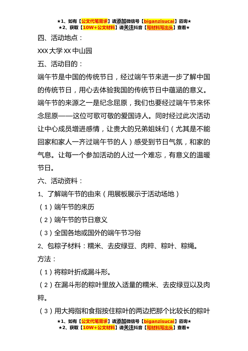 ★1、如有【公文代笔需求】请添加微信号【biganzisucai】咨询★★2、获取【10W+公文材料】请关注抖音【写材料写出头】查看★关于端午节活动方案汇编(8篇)方案1一、活动背景:夏历五月初五是中国的传统节日——端午节。“端”字有“初始”的意思,所以“端五”就是“初五”。而按照历法五月正是“午”月,所以“端五”也就渐渐演变成了此刻的“端午”。《燕京岁时记》记载:“初五为五月单五盖端字之转音也。”过端午节是我国两千多年来的习惯。端午节同时是一个能够和亲友团聚一齐度过的节日,端午节也能够举行许多活动,时至今日,端午节仍是一个十分盛行的节日。二、活动主题:我的端午,我做主,给自我一个端午节最棒的礼物三、活动日期:20XX年XX月XX日★1、如有【公文代笔需求】请添加微信号【biganzisucai...