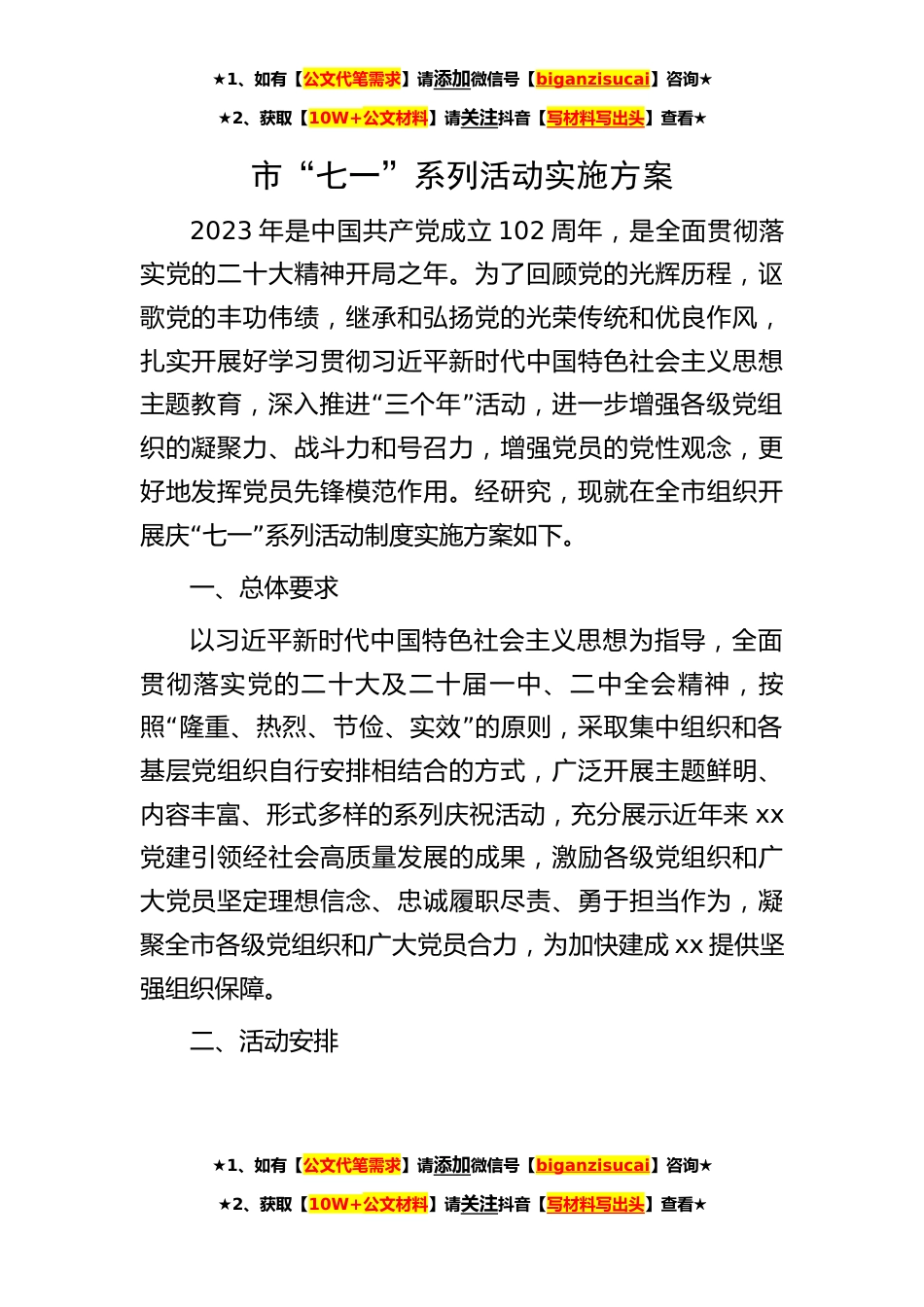 ★1、如有【公文代笔需求】请添加微信号【biganzisucai】咨询★★2、获取【10W+公文材料】请关注抖音【写材料写出头】查看★市“七一”系列活动实施方案2023年是中国共产党成立102周年,是全面贯彻落实党的二十大精神开局之年。为了回顾党的光辉历程,讴歌党的丰功伟绩,继承和弘扬党的光荣传统和优良作风,扎实开展好学习贯彻习近平新时代中国特色社会主义思想“”主题教育,深入推进三个年活动,进一步增强各级党组织的凝聚力、战斗力和号召力,增强党员的党性观念,更好地发挥党员先锋模范作用。经研究,现就在全市组织开“”展庆七一系列活动制度实施方案如下。一、总体要求以习近平新时代中国特色社会主义思想为指导,全面贯彻落实党的二十大及二十届一中、二中全会精神,按“”照隆重、热烈、节俭、实效的原...