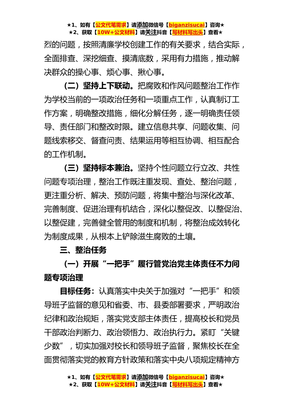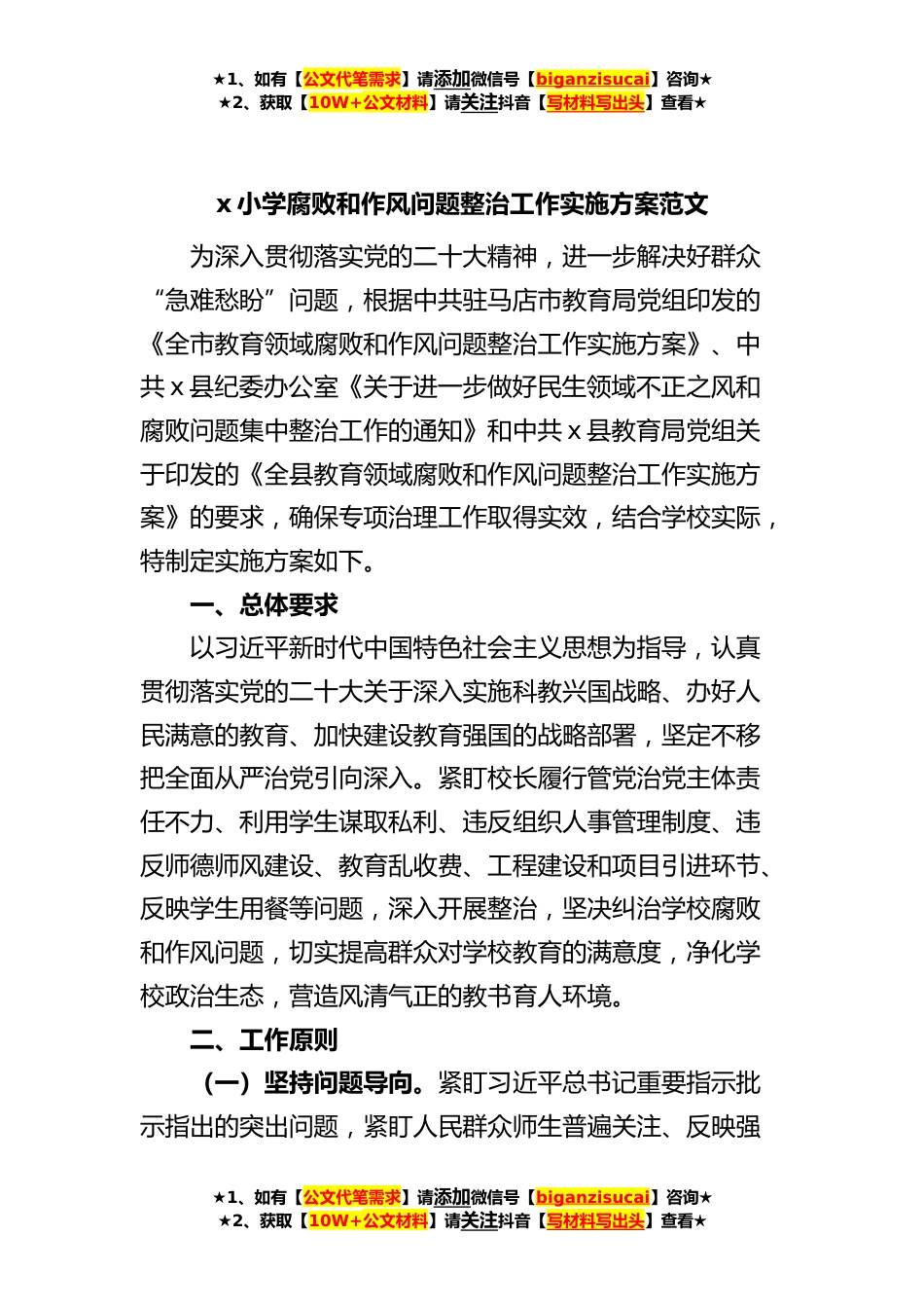 ★1、如有【公文代笔需求】请添加微信号【biganzisucai】咨询★★2、获取【10W+公文材料】请关注抖音【写材料写出头】查看★x小学腐败和作风问题整治工作实施方案范文为深入贯彻落实党的二十大精神,进一步解决好群众“急难愁盼”问题,根据中共驻马店市教育局党组印发的《全市教育领域腐败和作风问题整治工作实施方案》、中共x县纪委办公室《关于进一步做好民生领域不正之风和腐败问题集中整治工作的通知》和中共x县教育局党组关于印发的《全县教育领域腐败和作风问题整治工作实施方案》的要求,确保专项治理工作取得实效,结合学校实际,特制定实施方案如下。一、总体要求以习近平新时代中国特色社会主义思想为指导,认真贯彻落实党的二十大关于深入实施科教兴国战略、办好人民满意的教育、加快建设教育强国的战...