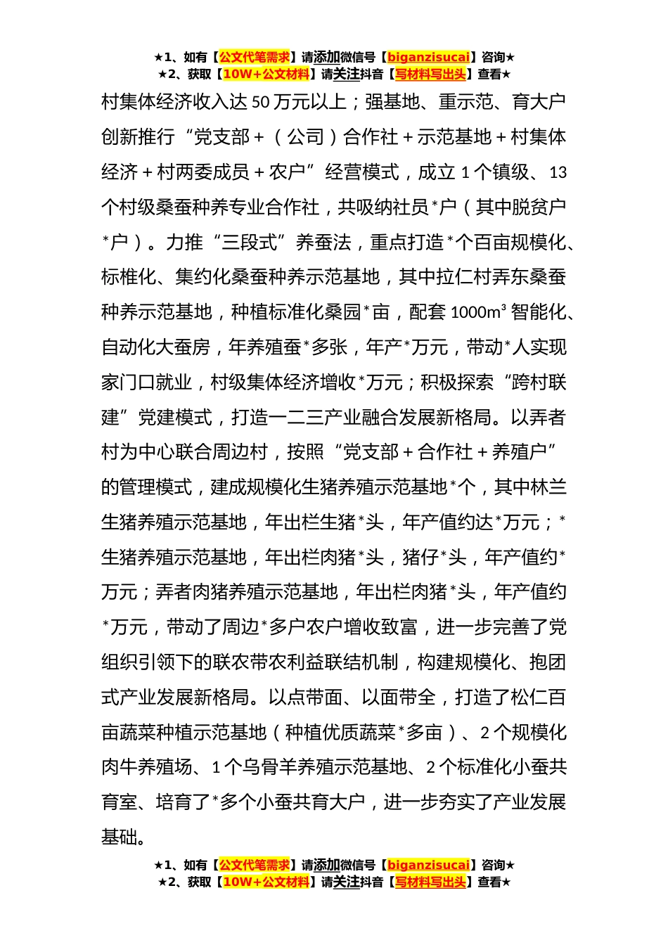 ★1、如有【公文代笔需求】请添加微信号【biganzisucai】咨询★★2、获取【10W+公文材料】请关注抖音【写材料写出头】查看★交流材料:以“党建+”模式引领乡村“五个”振兴近年来,*镇始终坚持以抓党建促乡村振兴为抓手,积极贯彻落实县委、县政府的决策部署,科学筹划,精心部署,以实现乡村振兴战略为总体目标,奋力促进产业、人才、文化、生态、组织“五个”振兴,为实现乡村全面振兴打下了坚实的基础。一、党建+产业,筑牢乡村振兴之“基”产业振兴是乡村振兴的物质基础,是解决农村一切问题的前提。*镇因地制宜探索“党建+产业”发展新路子。选准主导产业,充分发挥党支部引领作用,多点发力,做大做强镇“五大”特色产业(乌骨羊、桑蚕、蔬菜、生猪特色肉牛)。2022年以来,全镇落实村集体经济项目*个,...