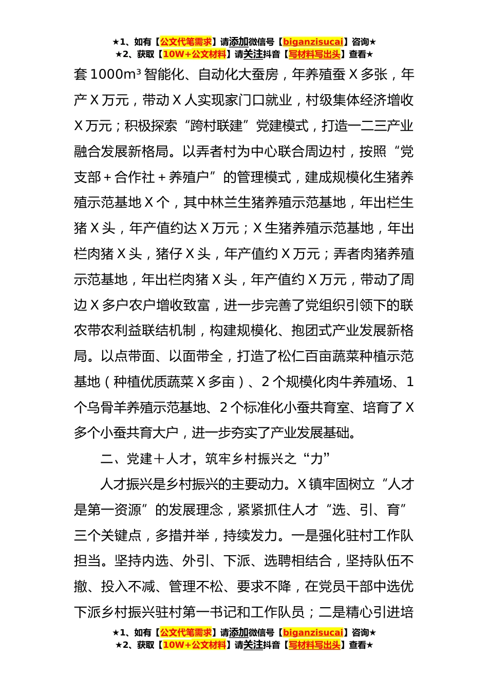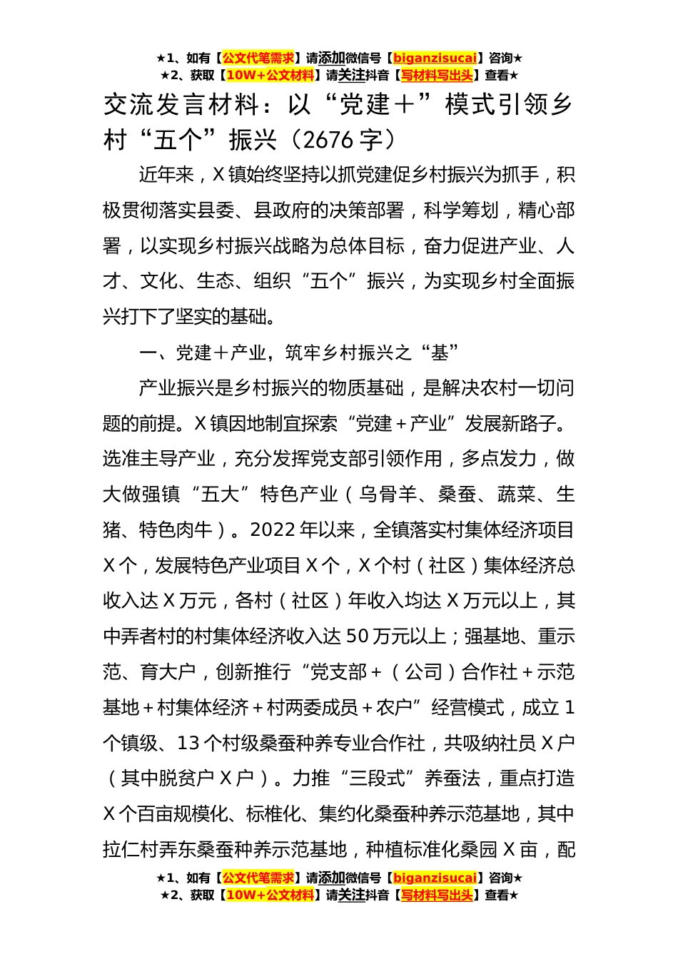 ★1、如有【公文代笔需求】请添加微信号【biganzisucai】咨询★★2、获取【10W+公文材料】请关注抖音【写材料写出头】查看★交流发言材料:以“党建+”模式引领乡村“五个”振兴(2676字)近年来,X镇始终坚持以抓党建促乡村振兴为抓手,积极贯彻落实县委、县政府的决策部署,科学筹划,精心部署,以实现乡村振兴战略为总体目标,奋力促进产业、人才、文化、生态、组织“五个”振兴,为实现乡村全面振兴打下了坚实的基础。一、党建+产业,筑牢乡村振兴之“基”产业振兴是乡村振兴的物质基础,是解决农村一切问题的前提。X镇因地制宜探索“党建+产业”发展新路子。选准主导产业,充分发挥党支部引领作用,多点发力,做大做强镇“五大”特色产业(乌骨羊、桑蚕、蔬菜、生猪、特色肉牛)。2022年以来,全镇落实村...