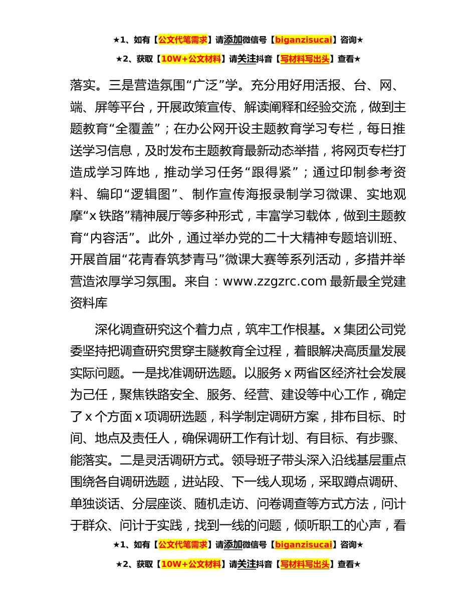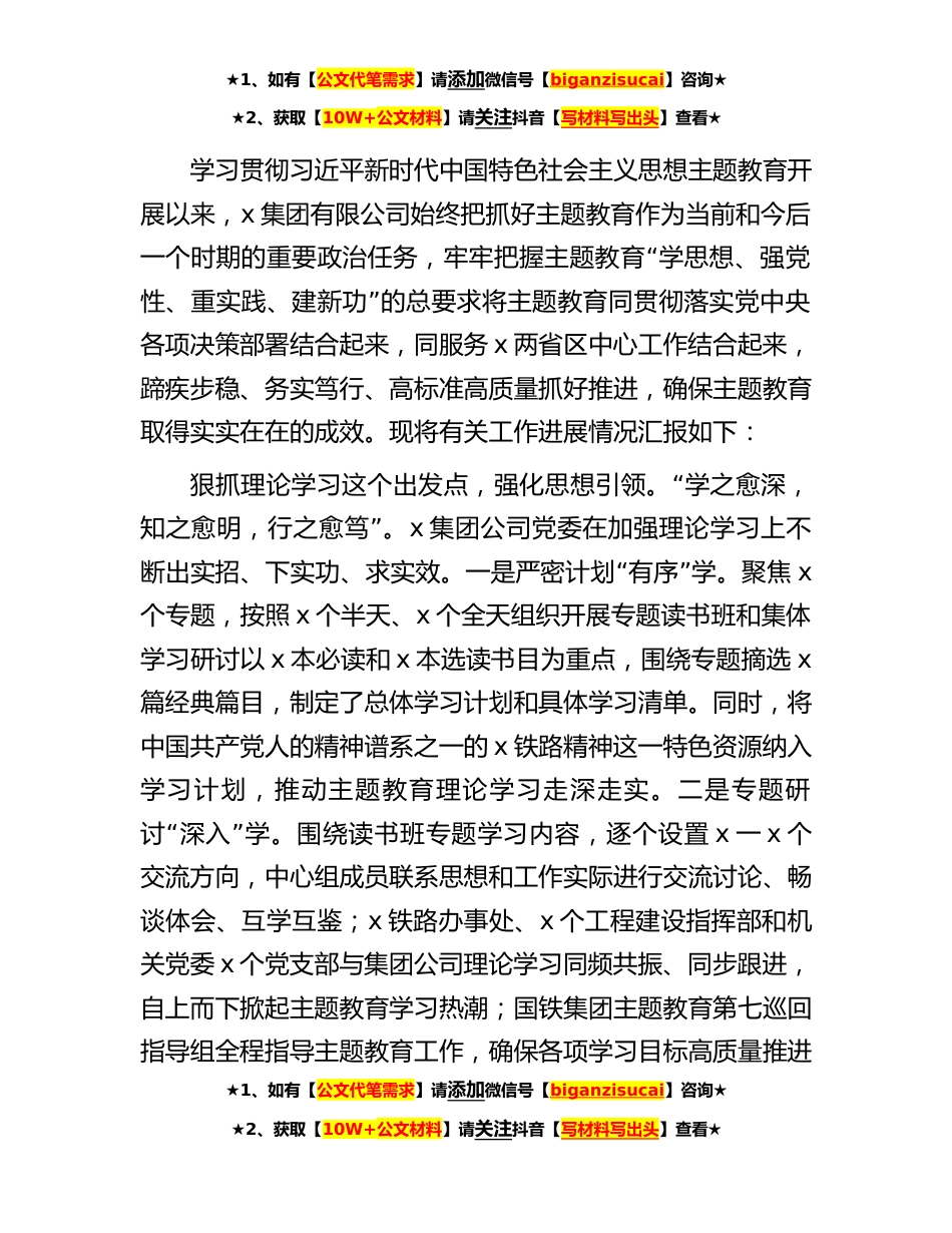 ★1、如有【公文代笔需求】请添加微信号【biganzisucai】咨询★★2、获取【10W+公文材料】请关注抖音【写材料写出头】查看★学习贯彻习近平新时代中国特色社会主义思想主题教育开展以来,x集团有限公司始终把抓好主题教育作为当前和今后“一个时期的重要政治任务,牢牢把握主题教育学思想、强党”性、重实践、建新功的总要求将主题教育同贯彻落实党中央各项决策部署结合起来,同服务x两省区中心工作结合起来,蹄疾步稳、务实笃行、高标准高质量抓好推进,确保主题教育取得实实在在的成效。现将有关工作进展情况汇报如下:“狠抓理论学习这个出发点,强化思想引领。学之愈深,”知之愈明,行之愈笃。x集团公司党委在加强理论学习上不“”断出实招、下实功、求实效。一是严密计划有序学。聚焦x个专题,按照x个半天、...