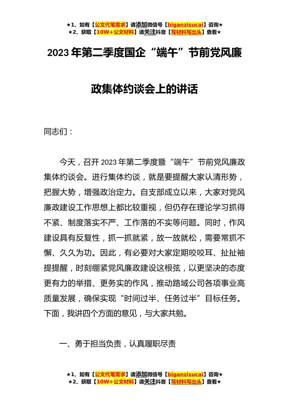 ★1、如有【公文代笔需求】请添加微信号【biganzisucai】咨询★★2、获取【10W+公文材料】请关注抖音【写材料写出头】查看★2023年第二季度国企“端午”节前党风廉政集体约谈会上的讲话同志们:今天,召开2023年第二季度暨“端午”节前党风廉政集体约谈会。进行集体约谈,就是要提醒大家认清形势,把握大势,增强政治定力。自支部成立以来,大家对党风廉政建设工作思想上都比较重视,但仍存在理论学习抓得不紧、制度落实不严、工作落的不实等问题。同时,作风建设具有反复性,抓一抓就紧,放一放就松,需要常抓不懈、久久为功。因此,有必要对大家定期咬咬耳、扯扯袖提提醒,时刻绷紧党风廉政建设这根弦,以更坚决的态度更有力的举措、更务实的作风,推动路域公司各项事业高质量发展,确保实现“时间过半、任务过...