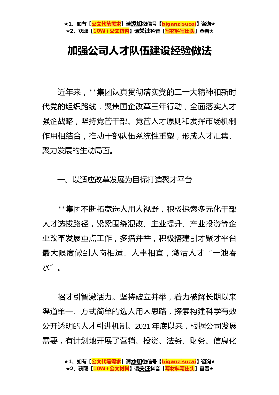 ★1、如有【公文代笔需求】请添加微信号【biganzisucai】咨询★★2、获取【10W+公文材料】请关注抖音【写材料写出头】查看★加强公司人才队伍建设经验做法近年来,**集团认真贯彻落实党的二十大精神和新时代党的组织路线,聚焦国企改革三年行动,全面落实人才强企战略,坚持党管干部、党管人才原则和发挥市场机制作用相结合,推动干部队伍系统性重塑,形成人才汇集、聚力发展的生动局面。一、以适应改革发展为目标打造聚才平台**集团不断拓宽选人用人视野,积极探索多元化干部人才选拔路径,紧紧围绕混改、主业提升、产业投资等企业改革发展重点工作,多措并举,积极搭建引才聚才平台最大限度做到人岗相适、人事相宜,激活人才“一池春水”。招才引智激活力。坚持破立并举,着力破解长期以来渠道单一、方式简单的...