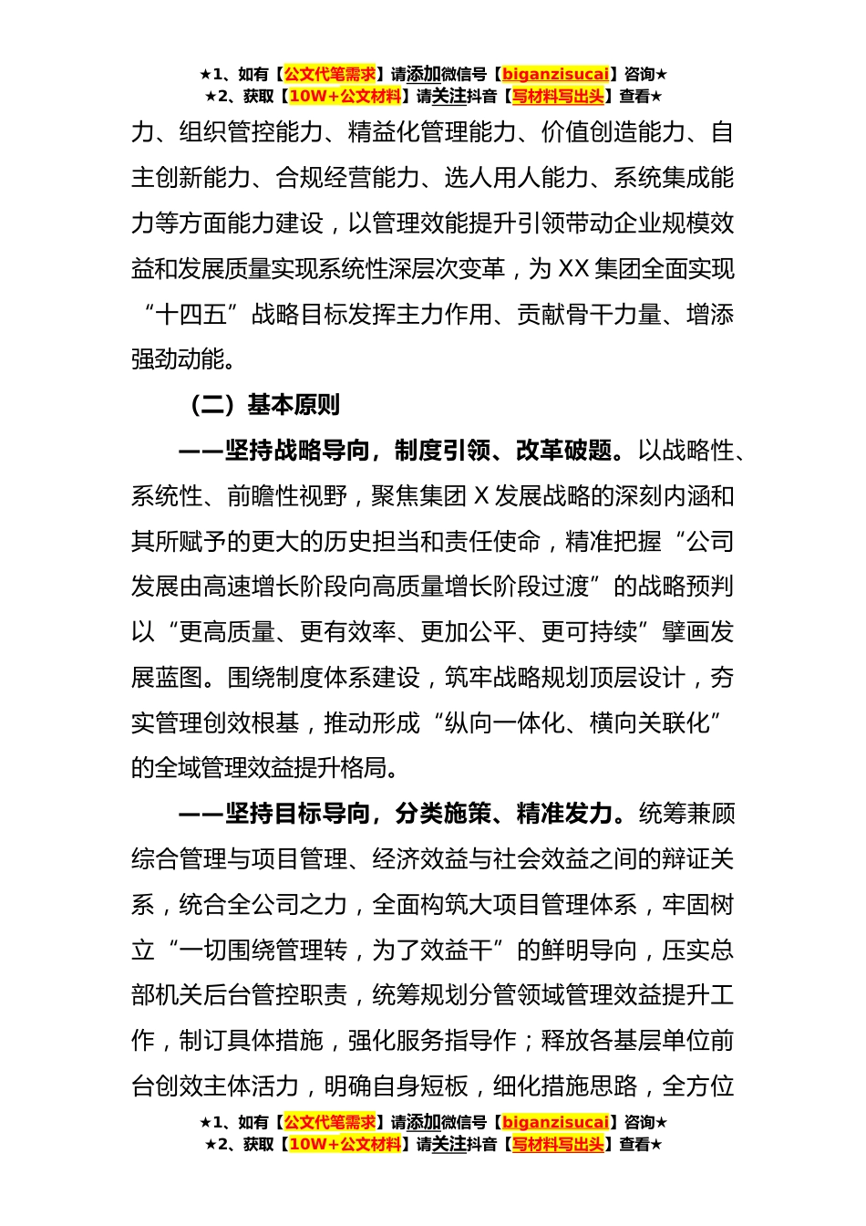 ★1、如有【公文代笔需求】请添加微信号【biganzisucai】咨询★★2、获取【10W+公文材料】请关注抖音【写材料写出头】查看★某国企管理提升三年行动实施方案为深入贯彻落实X集团“十四五”规划战略部署,强化系列改革系统集成,拓展国企改革“改革三年行动”和“管理标杆创建行动”实施路径,全面提升服务打造X战略目标的使命感和打赢能力,持续增强助力公司高质量发展的改革攻坚能力和管理创效能力,推动“管理价值创造”向经济效益和社会效益的深层次维度递进,为“十四五”时期公司各项事业高质量可持续发展提供坚实的制度保障和行动指南,根据系列改革总体部署,结合企业管理实际,制定本方案如下:一、总体要求(一)指导思想以习近平新时代中国特色社会主义思想为指导,深入贯彻贯彻习近平总书记关于国有企...