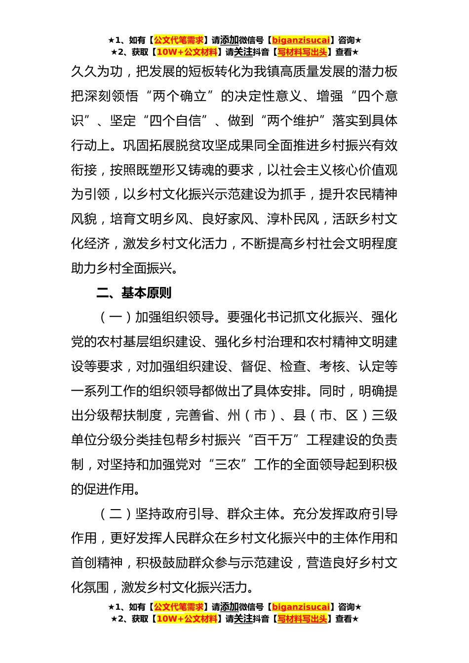 ★1、如有【公文代笔需求】请添加微信号【biganzisucai】咨询★★2、获取【10W+公文材料】请关注抖音【写材料写出头】查看★XX镇乡村文化振兴“百千万”工程实施方案为全面实施乡村振兴战略,推进乡村文化振兴,根据《中共中央宣传部等关于印发〈推进乡村文化振兴工作方案〉的通知》《中共XX省委宣传部等关于印发〈XX省乡村文化振兴“百千万”工程实施方案〉的通知》《中共XX市委宣传部等关于印发〈XX市乡村文化振兴“百千万”工程实施方案〉的通知》中共XX市委宣传部等关于印发《XX市乡村文化振兴“百千万”工程实施方案》的通知等文件精神,聚焦做强主导产业、做优特色农业持续发力,全力实现农业高质高效、乡村宜居宜业的总目标,特制定本实施方案。一、指导思想坚持以习近平新时代中国特色社会主义思想为指导...
