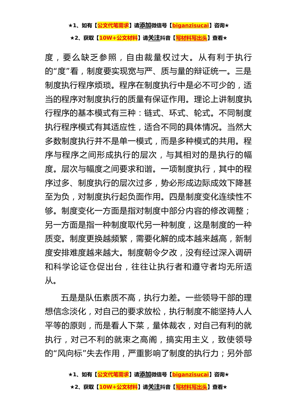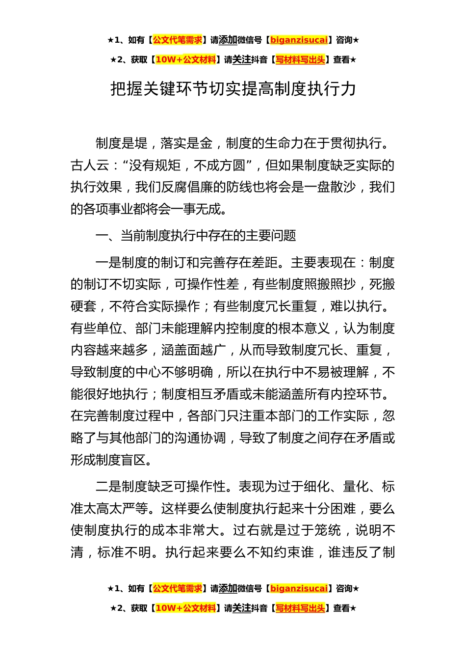 ★1、如有【公文代笔需求】请添加微信号【biganzisucai】咨询★★2、获取【10W+公文材料】请关注抖音【写材料写出头】查看★把握关键环节切实提高制度执行力制度是堤,落实是金,制度的生命力在于贯彻执行。“”古人云:没有规矩,不成方圆,但如果制度缺乏实际的执行效果,我们反腐倡廉的防线也将会是一盘散沙,我们的各项事业都将会一事无成。一、当前制度执行中存在的主要问题一是制度的制订和完善存在差距。主要表现在:制度的制订不切实际,可操作性差,有些制度照搬照抄,死搬硬套,不符合实际操作;有些制度冗长重复,难以执行。有些单位、部门未能理解内控制度的根本意义,认为制度内容越来越多,涵盖面越广,从而导致制度冗长、重复,导致制度的中心不够明确,所以在执行中不易被理解,不能很好地执行;...