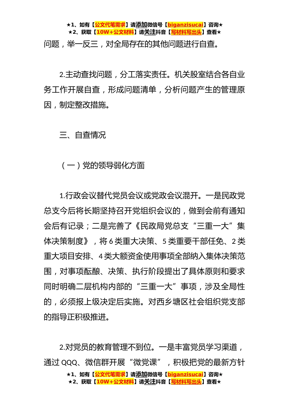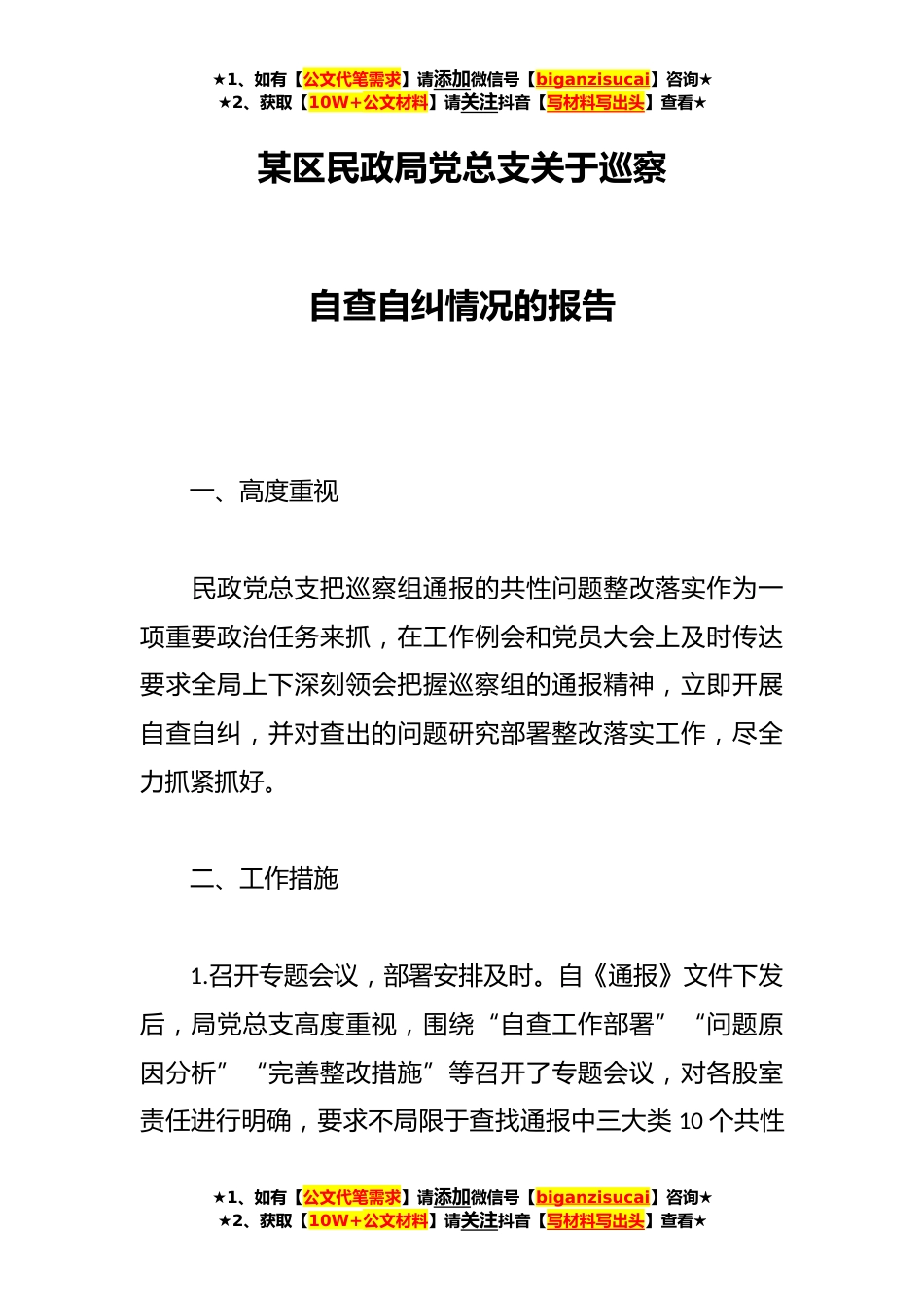 ★1、如有【公文代笔需求】请添加微信号【biganzisucai】咨询★★2、获取【10W+公文材料】请关注抖音【写材料写出头】查看★某区民政局党总支关于巡察自查自纠情况的报告一、高度重视民政党总支把巡察组通报的共性问题整改落实作为一项重要政治任务来抓,在工作例会和党员大会上及时传达要求全局上下深刻领会把握巡察组的通报精神,立即开展自查自纠,并对查出的问题研究部署整改落实工作,尽全力抓紧抓好。二、工作措施1.召开专题会议,部署安排及时。自《通报》文件下发后,局党总支高度重视,围绕“自查工作部署”“问题原因分析”“完善整改措施”等召开了专题会议,对各股室责任进行明确,要求不局限于查找通报中三大类10个共性★1、如有【公文代笔需求】请添加微信号【biganzisucai】咨询★★2、获取【10W+...