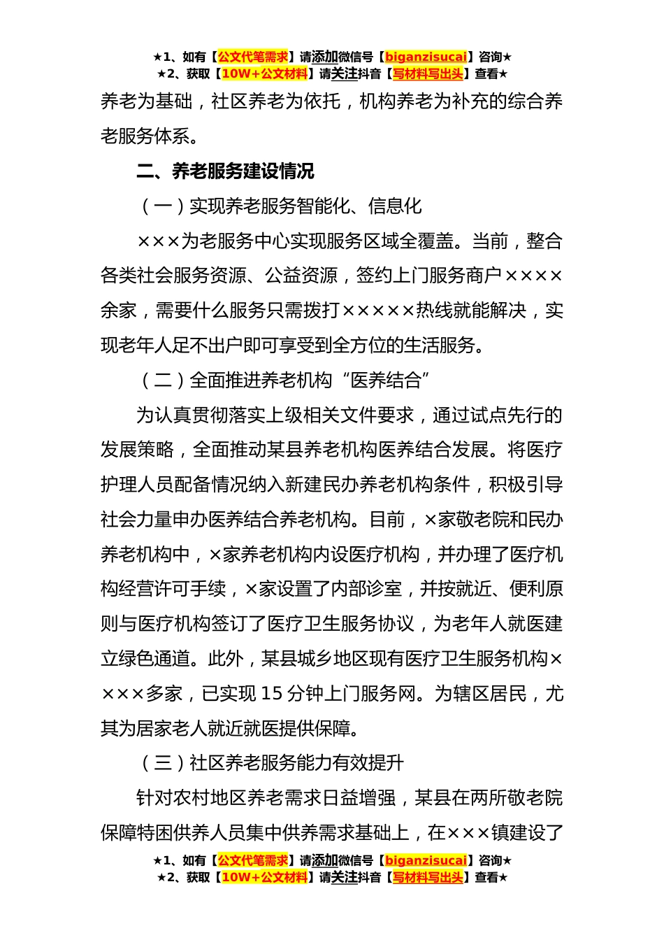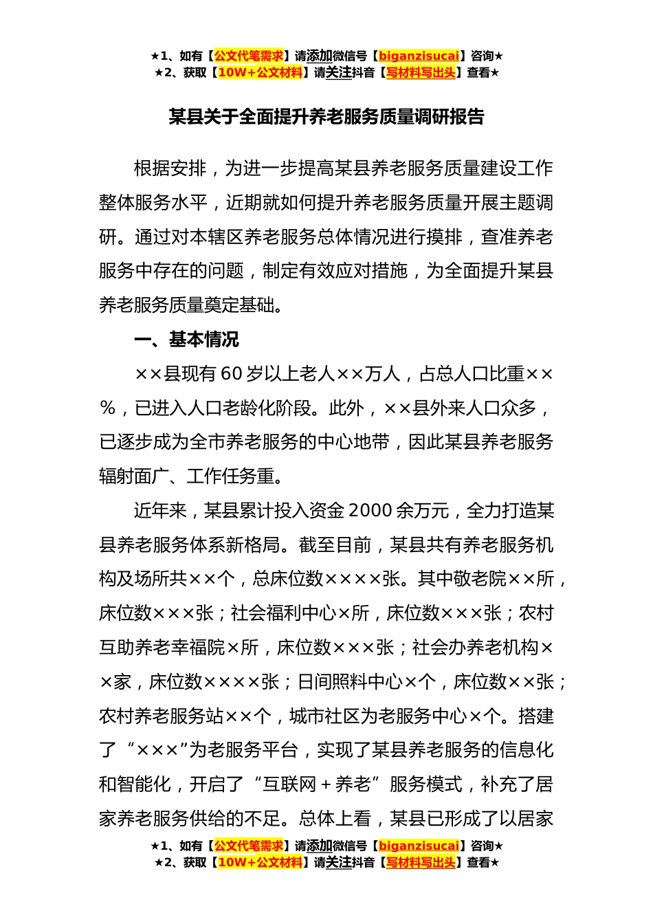 ★1、如有【公文代笔需求】请添加微信号【biganzisucai】咨询★★2、获取【10W+公文材料】请关注抖音【写材料写出头】查看★某县关于全面提升养老服务质量调研报告根据安排,为进一步提高某县养老服务质量建设工作整体服务水平,近期就如何提升养老服务质量开展主题调研。通过对本辖区养老服务总体情况进行摸排,查准养老服务中存在的问题,制定有效应对措施,为全面提升某县养老服务质量奠定基础。一、基本情况××县现有60岁以上老人××万人,占总人口比重××%,已进入人口老龄化阶段。此外,××县外来人口众多,已逐步成为全市养老服务的中心地带,因此某县养老服务辐射面广、工作任务重。近年来,某县累计投入资金2000余万元,全力打造某县养老服务体系新格局。截至目前,某县共有养老服务机构及场所共×...