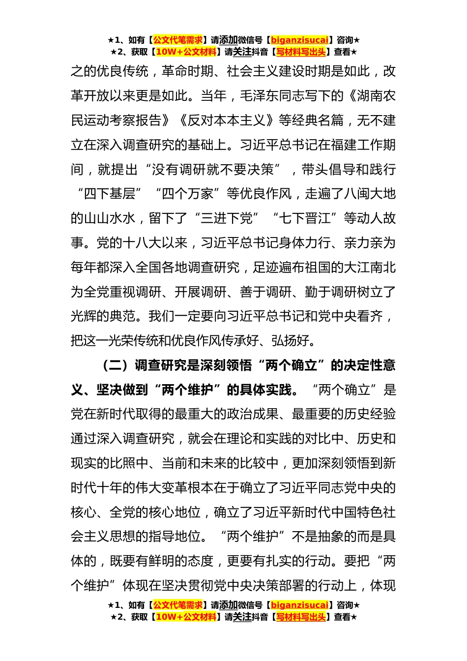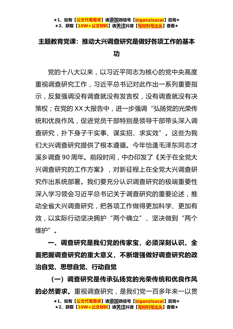 ★1、如有【公文代笔需求】请添加微信号【biganzisucai】咨询★★2、获取【10W+公文材料】请关注抖音【写材料写出头】查看★主题教育党课:推动大兴调查研究是做好各项工作的基本功党的十八大以来,以习近平同志为核心的党中央高度重视调查研究工作,习近平总书记对此作出一系列重要指示,反复强调没有调查就没有发言权,没有调查就没有决策权;在党的XX大报告中,进一步强调“弘扬党的光荣传统和优良作风,促进党员干部特别是领导干部带头深入调查研究,扑下身子干实事、谋实招、求实效”。这些为我们大兴调查研究提供了根本遵循。今年恰逢毛泽东同志才溪乡调查90周年。前段时间,中办印发了《关于在全党大兴调查研究的工作方案》,对新征程上在全党大兴调查研究作出系统部署。我们要充分认识调查研究的极端重要...