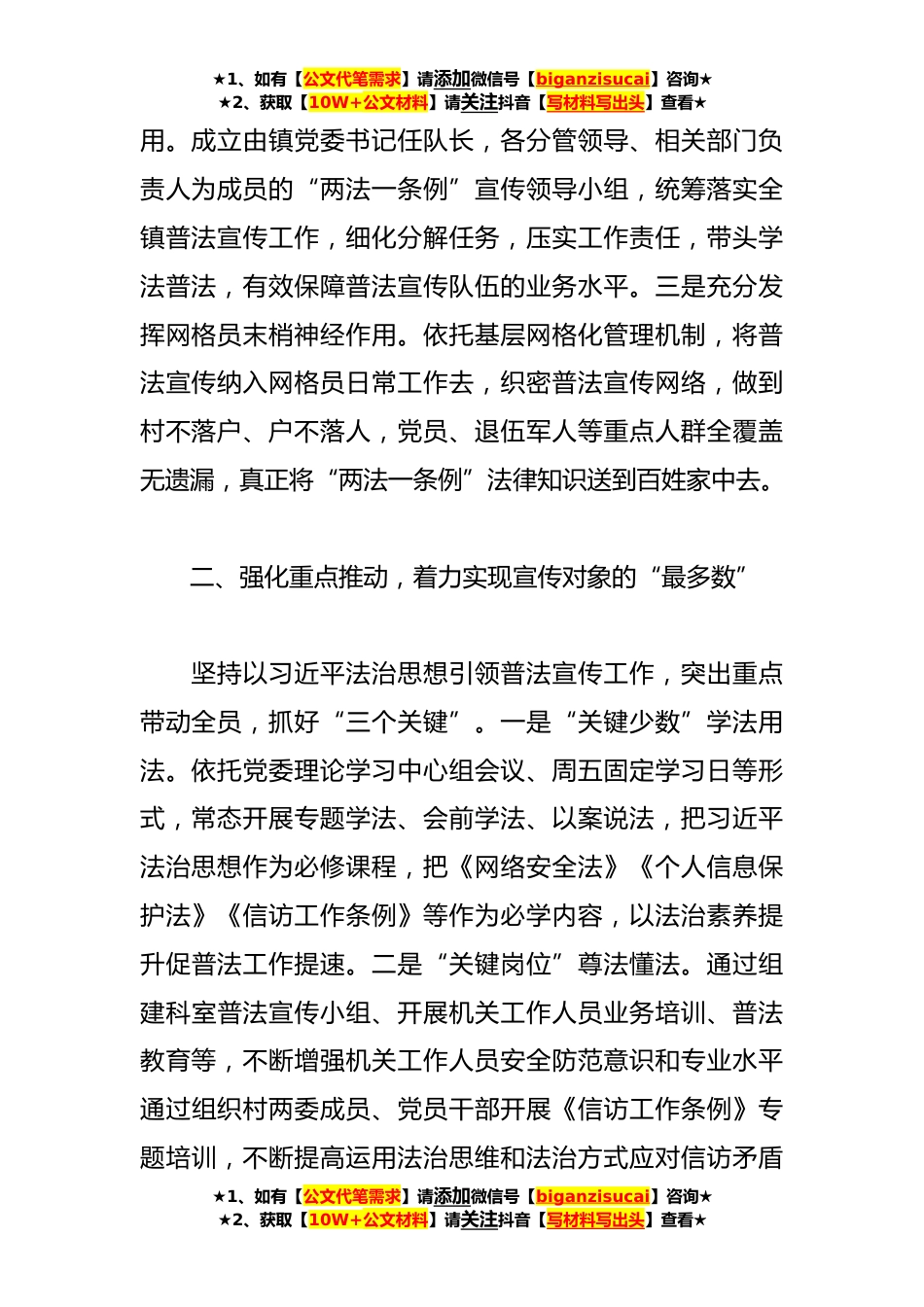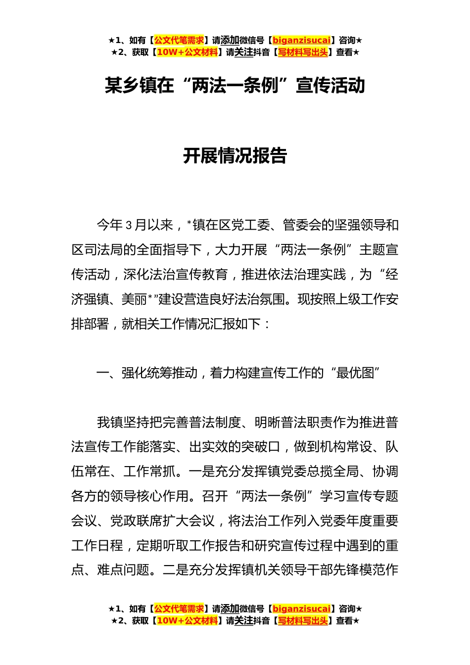 ★1、如有【公文代笔需求】请添加微信号【biganzisucai】咨询★★2、获取【10W+公文材料】请关注抖音【写材料写出头】查看★某乡镇在“两法一条例”宣传活动开展情况报告今年3月以来,*镇在区党工委、管委会的坚强领导和区司法局的全面指导下,大力开展“两法一条例”主题宣传活动,深化法治宣传教育,推进依法治理实践,为“经济强镇、美丽*”建设营造良好法治氛围。现按照上级工作安排部署,就相关工作情况汇报如下:一、强化统筹推动,着力构建宣传工作的“最优图”我镇坚持把完善普法制度、明晰普法职责作为推进普法宣传工作能落实、出实效的突破口,做到机构常设、队伍常在、工作常抓。一是充分发挥镇党委总揽全局、协调各方的领导核心作用。召开“两法一条例”学习宣传专题会议、党政联席扩大会议,将法治工...