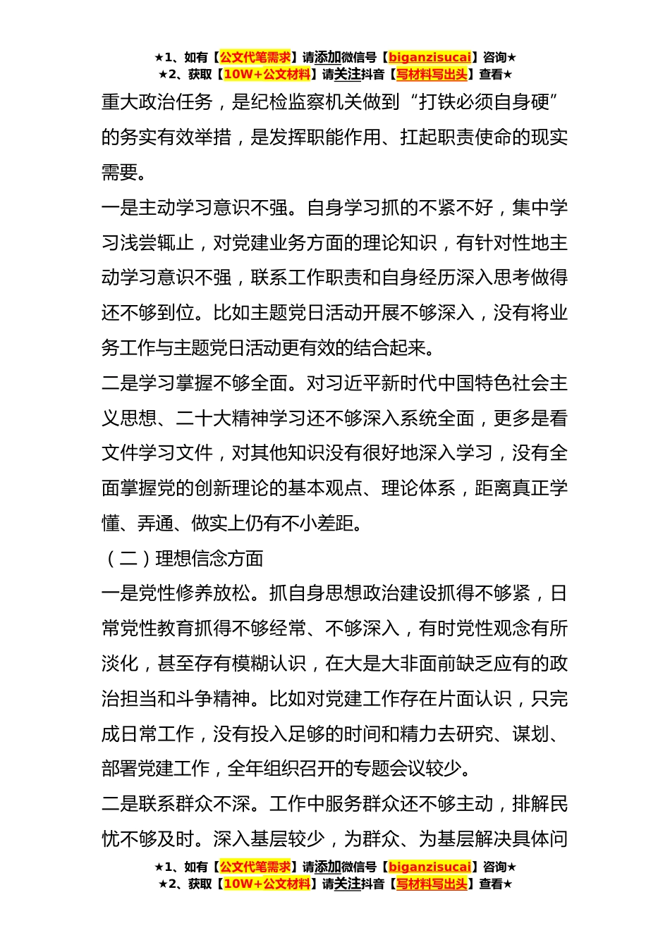 ★1、如有【公文代笔需求】请添加微信号【biganzisucai】咨询★★2、获取【10W+公文材料】请关注抖音【写材料写出头】查看★关于开展纪检监察干部教育整顿个人对照检查材料自参与教育整顿以来,本人按照要求,认真学习了习近平总书记关于加强纪检监察干部队伍建设的重要论述以及指定的学习篇目。通过学习,更加深刻地认识到纪检监察机关是党的“纪律部队”,巡察干部队伍是推进党的自我革命、全面从严治党的重要力量;更加充分地认识到开展教育整顿的重大意义,自觉接受刻骨铭心的革命性锻造和深入灵魂的精神洗礼,铸就政治忠诚、清除害群之马、健全严管体系、增强斗争本领,确保党和人民赋予的权力不被滥用、惩恶扬善的利剑永不蒙尘,真正做到让党中央和习近平总书记放心、让人民群众满意。现将个人对照检查情况...
