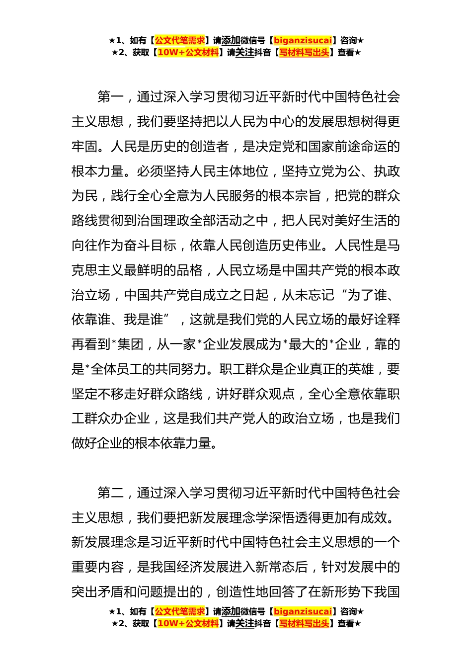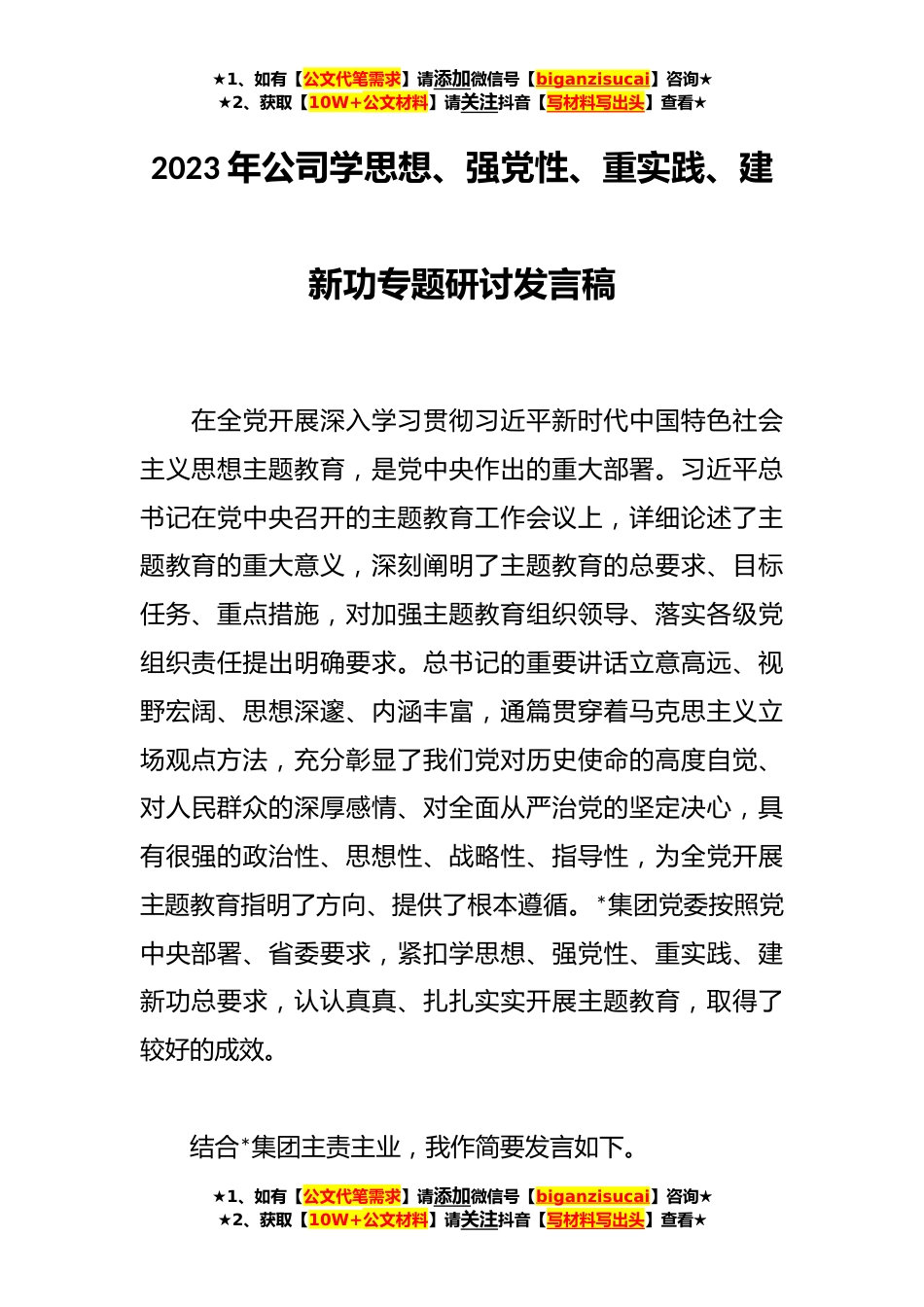 ★1、如有【公文代笔需求】请添加微信号【biganzisucai】咨询★★2、获取【10W+公文材料】请关注抖音【写材料写出头】查看★2023年公司学思想、强党性、重实践、建新功专题研讨发言稿在全党开展深入学习贯彻习近平新时代中国特色社会主义思想主题教育,是党中央作出的重大部署。习近平总书记在党中央召开的主题教育工作会议上,详细论述了主题教育的重大意义,深刻阐明了主题教育的总要求、目标任务、重点措施,对加强主题教育组织领导、落实各级党组织责任提出明确要求。总书记的重要讲话立意高远、视野宏阔、思想深邃、内涵丰富,通篇贯穿着马克思主义立场观点方法,充分彰显了我们党对历史使命的高度自觉、对人民群众的深厚感情、对全面从严治党的坚定决心,具有很强的政治性、思想性、战略性、指导性,为全党...