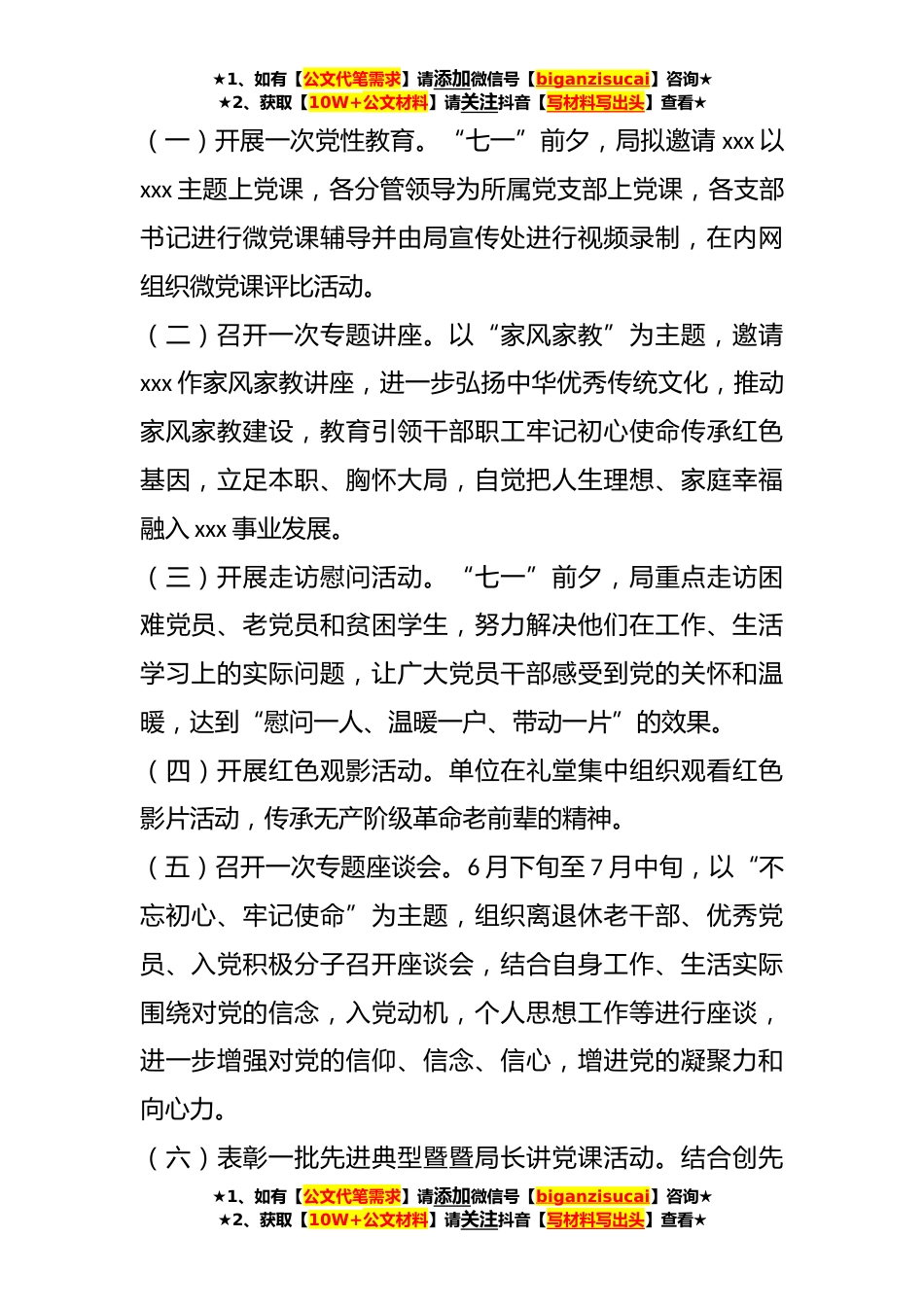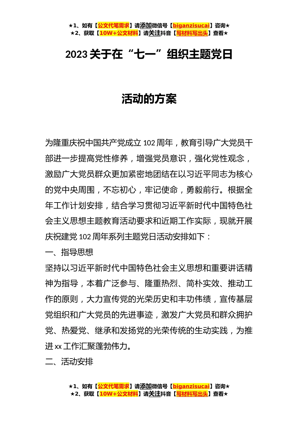 ★1、如有【公文代笔需求】请添加微信号【biganzisucai】咨询★★2、获取【10W+公文材料】请关注抖音【写材料写出头】查看★2023关于在“七一”组织主题党日活动的方案为隆重庆祝中国共产党成立102周年,教育引导广大党员干部进一步提高党性修养,增强党员意识,强化党性观念,激励广大党员群众更加紧密地团结在以习近平同志为核心的党中央周围,不忘初心,牢记使命,勇毅前行。根据全年工作计划安排,结合学习贯彻习近平新时代中国特色社会主义思想主题教育活动要求和近期工作实际,现就开展庆祝建党102周年系列主题党日活动安排如下:一、指导思想坚持以习近平新时代中国特色社会主义思想和重要讲话精神为指导,本着广泛参与、隆重热烈、简朴实效、推动工作的原则,大力宣传党的光荣历史和丰功伟绩,宣传基层党...