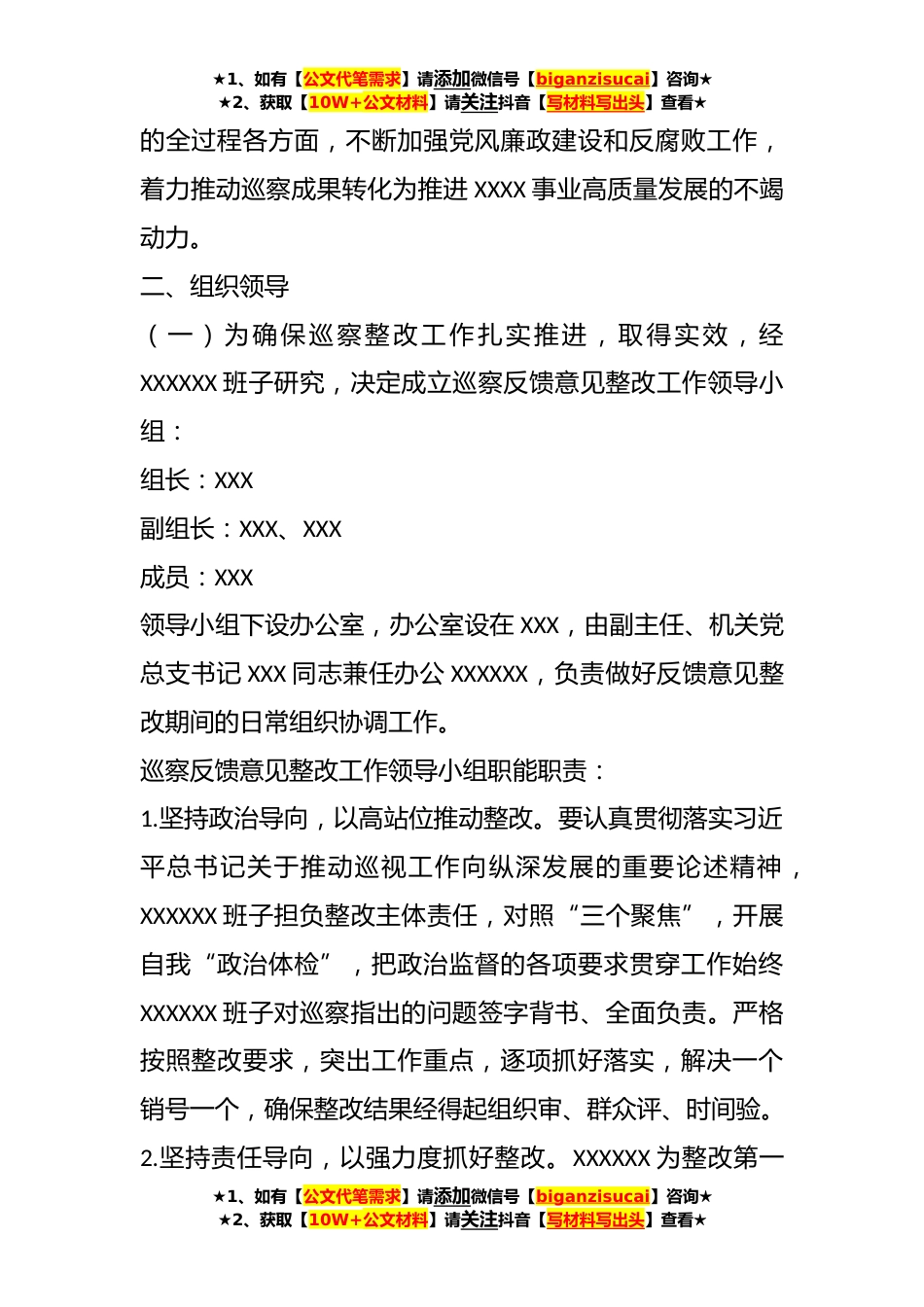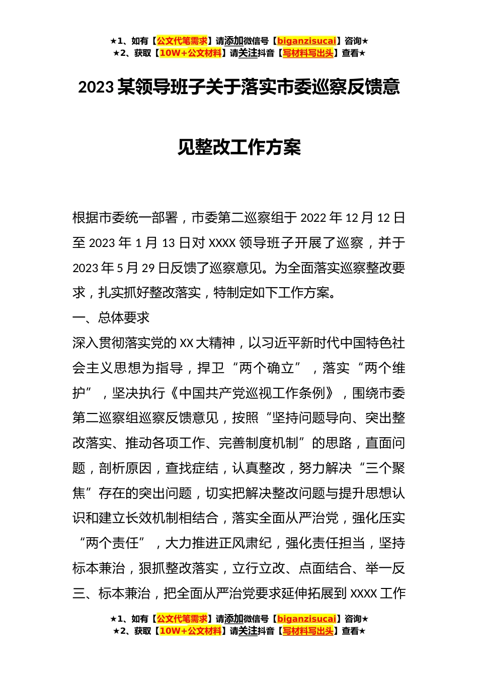 ★1、如有【公文代笔需求】请添加微信号【biganzisucai】咨询★★2、获取【10W+公文材料】请关注抖音【写材料写出头】查看★2023某领导班子关于落实市委巡察反馈意见整改工作方案根据市委统一部署,市委第二巡察组于2022年12月12日至2023年1月13日对XXXX领导班子开展了巡察,并于2023年5月29日反馈了巡察意见。为全面落实巡察整改要求,扎实抓好整改落实,特制定如下工作方案。一、总体要求深入贯彻落实党的XX大精神,以习近平新时代中国特色社会主义思想为指导,捍卫“两个确立”,落实“两个维护”,坚决执行《中国共产党巡视工作条例》,围绕市委第二巡察组巡察反馈意见,按照“坚持问题导向、突出整改落实、推动各项工作、完善制度机制”的思路,直面问题,剖析原因,查找症结,认真整改,努力解决“三个聚焦...