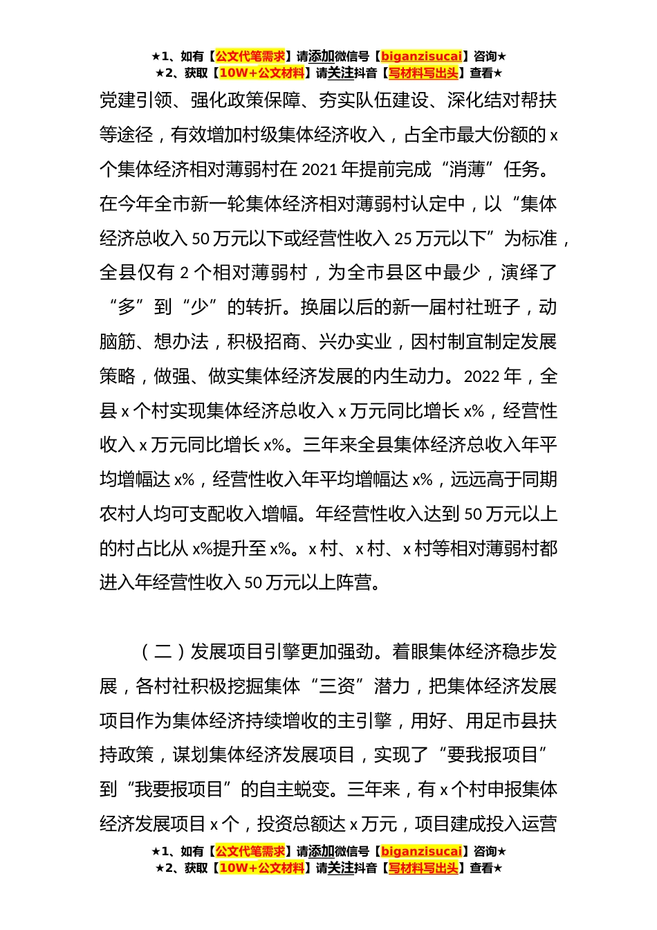 ★1、如有【公文代笔需求】请添加微信号【biganzisucai】咨询★★2、获取【10W+公文材料】请关注抖音【写材料写出头】查看★领导在关于全县集体经济发展座谈会上的讲话同志们:近年来,我县贯彻落实省政府关于支持x县走高质量发展共同富裕特色之路工作要求,全面深化以集体经济为核心的强村富民乡村集成改革,锚定目标,主动作为,持续壮大村级集体经济。今年第一季度,全县村集体经济收入总量万元,同比增长%,其中经营性收入万元,同比增长%。经营性收入50万元以上的村达个,占比%,顺利完成第一季度目标。下面,我讲三点意见。一、肯定成绩,提振村级集体经济发展的信心决心(一)集体经济家底更加殷实。自2019年以来,我县始终坚守“消薄”底线,聚焦“后进村”建设,通过加强★1、如有【公文代笔需求】请添加...