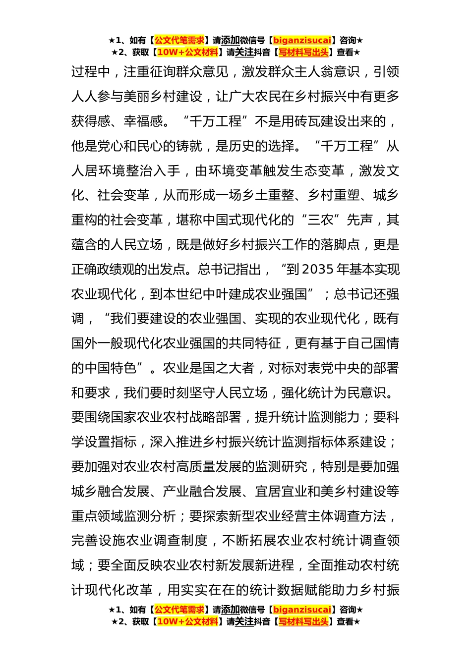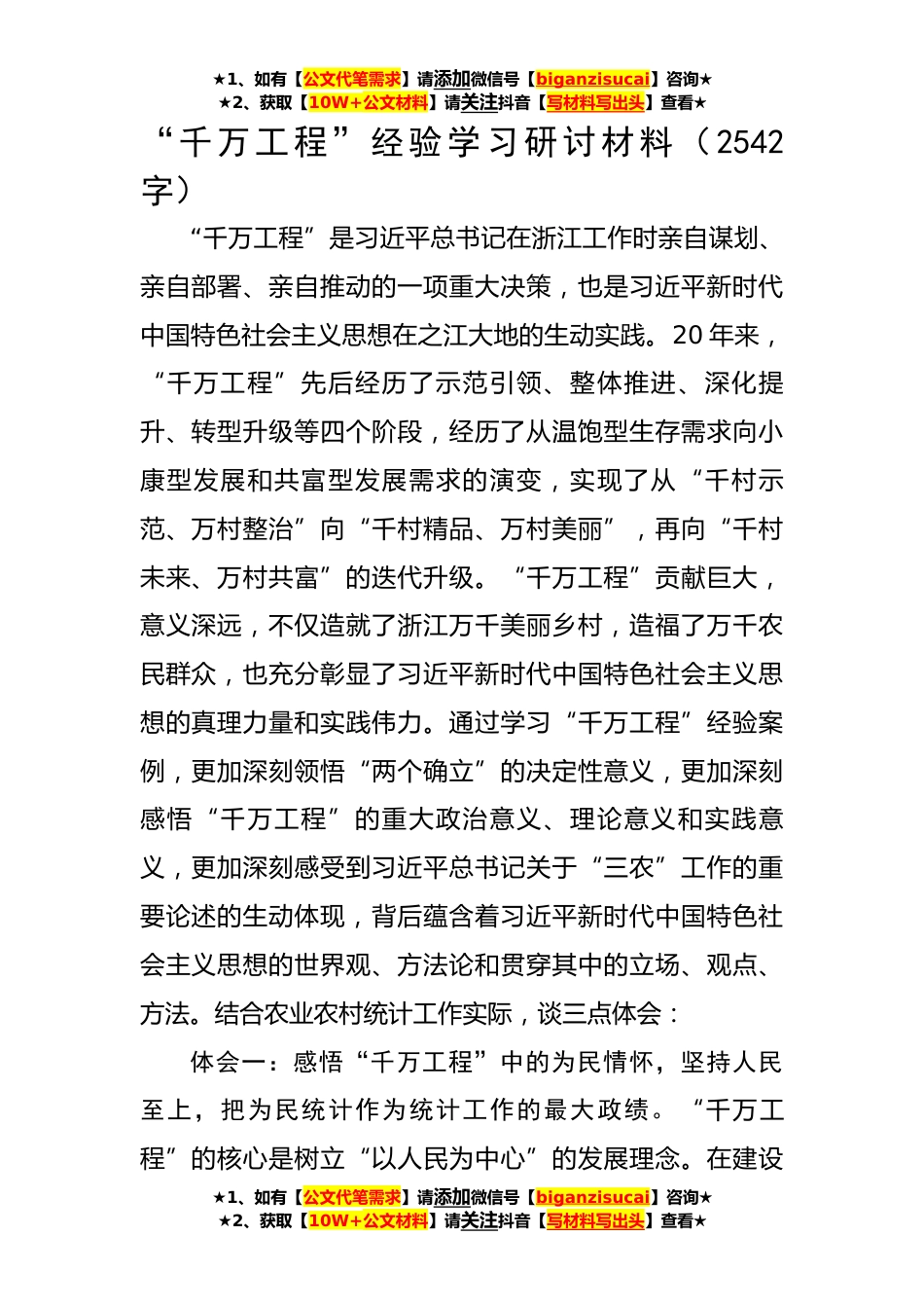 ★1、如有【公文代笔需求】请添加微信号【biganzisucai】咨询★★2、获取【10W+公文材料】请关注抖音【写材料写出头】查看★“千万工程”经验学习研讨材料(2542字)“千万工程”是习近平总书记在浙江工作时亲自谋划、亲自部署、亲自推动的一项重大决策,也是习近平新时代中国特色社会主义思想在之江大地的生动实践。20年来,“千万工程”先后经历了示范引领、整体推进、深化提升、转型升级等四个阶段,经历了从温饱型生存需求向小康型发展和共富型发展需求的演变,实现了从“千村示范、万村整治”向“千村精品、万村美丽”,再向“千村未来、万村共富”的迭代升级。“千万工程”贡献巨大,意义深远,不仅造就了浙江万千美丽乡村,造福了万千农民群众,也充分彰显了习近平新时代中国特色社会主义思想的真理力量和...