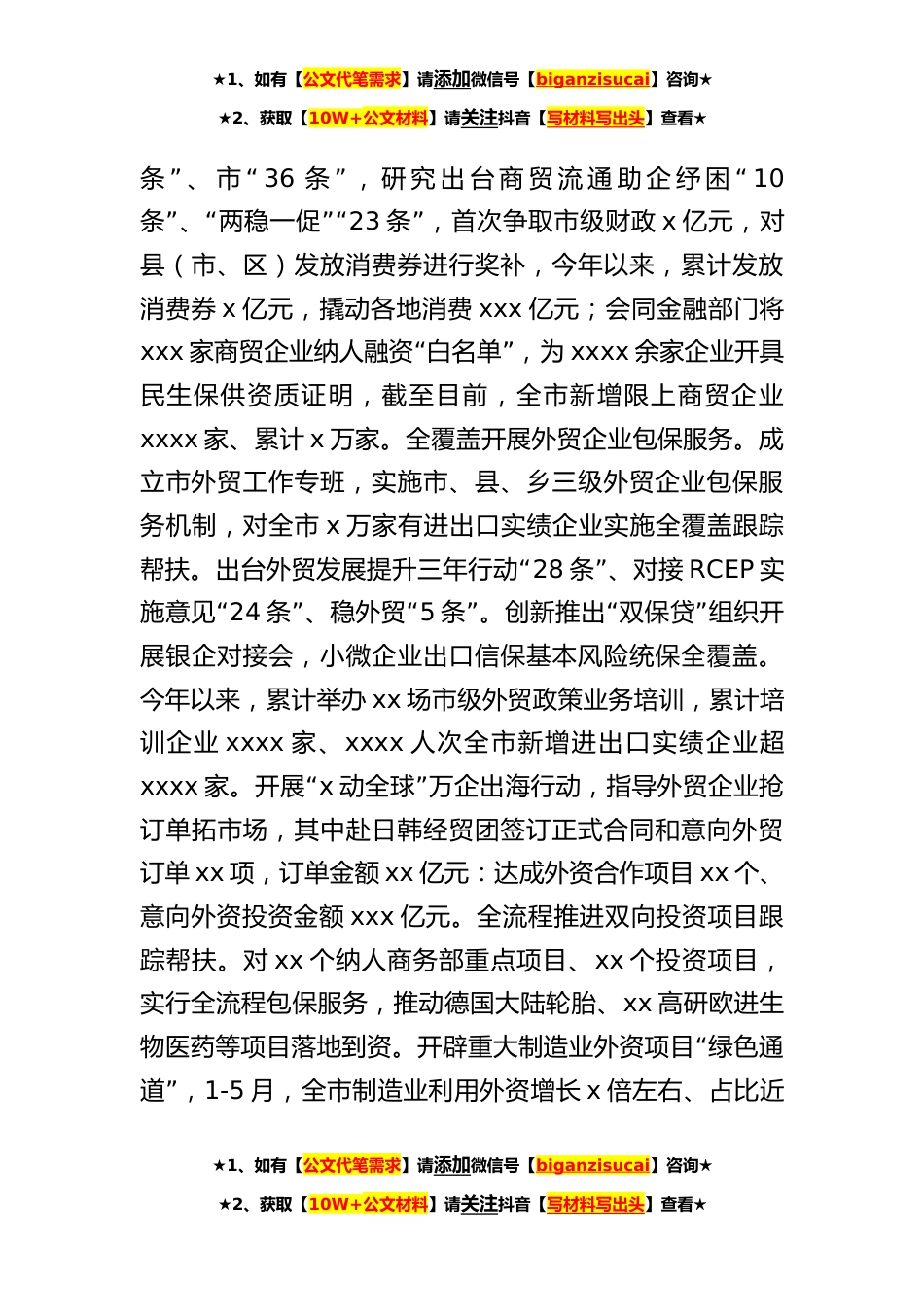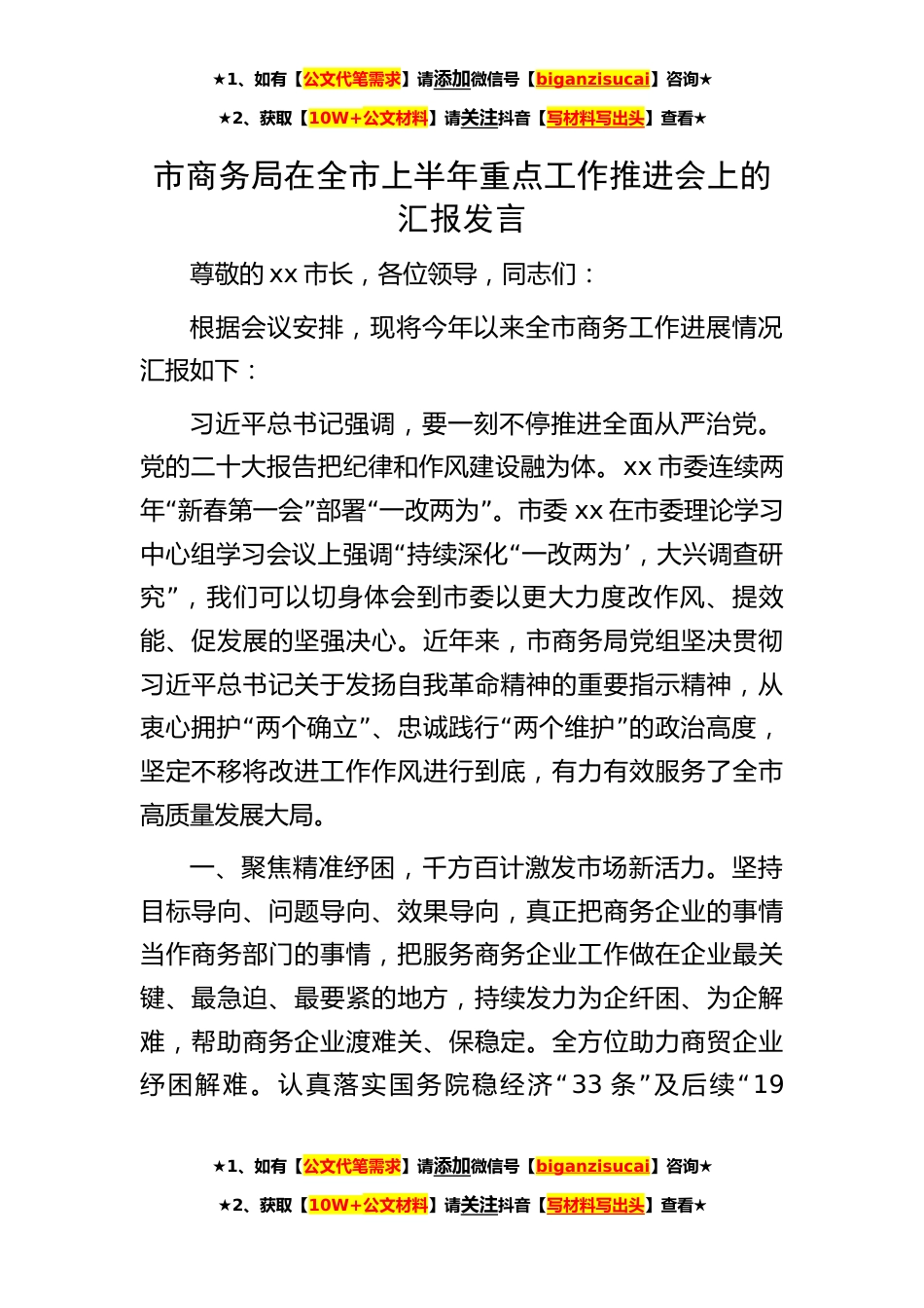 ★1、如有【公文代笔需求】请添加微信号【biganzisucai】咨询★★2、获取【10W+公文材料】请关注抖音【写材料写出头】查看★市商务局在全市上半年重点工作推进会上的汇报发言尊敬的xx市长,各位领导,同志们:根据会议安排,现将今年以来全市商务工作进展情况汇报如下:习近平总书记强调,要一刻不停推进全面从严治党。党的二十大报告把纪律和作风建设融为体。xx市委连续两“”“”年新春第一会部署一改两为。市委xx在市委理论学习““’中心组学习会议上强调持续深化一改两为,大兴调查研”究,我们可以切身体会到市委以更大力度改作风、提效能、促发展的坚强决心。近年来,市商务局党组坚决贯彻习近平总书记关于发扬自我革命精神的重要指示精神,从“”“”衷心拥护两个确立、忠诚践行两个维护的政治高度,坚定...
