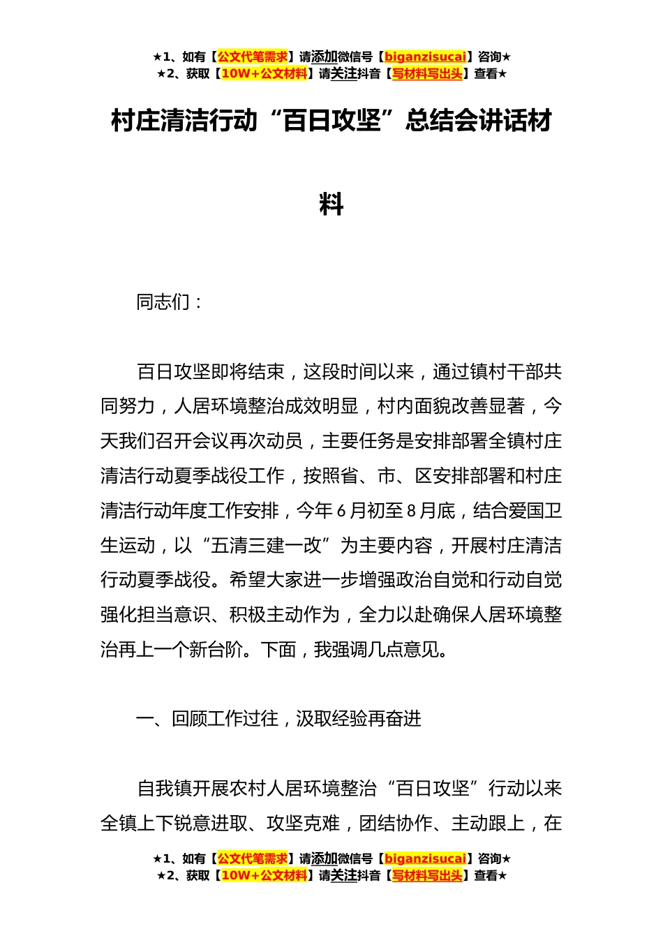 ★1、如有【公文代笔需求】请添加微信号【biganzisucai】咨询★★2、获取【10W+公文材料】请关注抖音【写材料写出头】查看★村庄清洁行动“百日攻坚”总结会讲话材料同志们:百日攻坚即将结束,这段时间以来,通过镇村干部共同努力,人居环境整治成效明显,村内面貌改善显著,今天我们召开会议再次动员,主要任务是安排部署全镇村庄清洁行动夏季战役工作,按照省、市、区安排部署和村庄清洁行动年度工作安排,今年6月初至8月底,结合爱国卫生运动,以“五清三建一改”为主要内容,开展村庄清洁行动夏季战役。希望大家进一步增强政治自觉和行动自觉强化担当意识、积极主动作为,全力以赴确保人居环境整治再上一个新台阶。下面,我强调几点意见。一、回顾工作过往,汲取经验再奋进自我镇开展农村人居环境整治“百日...
