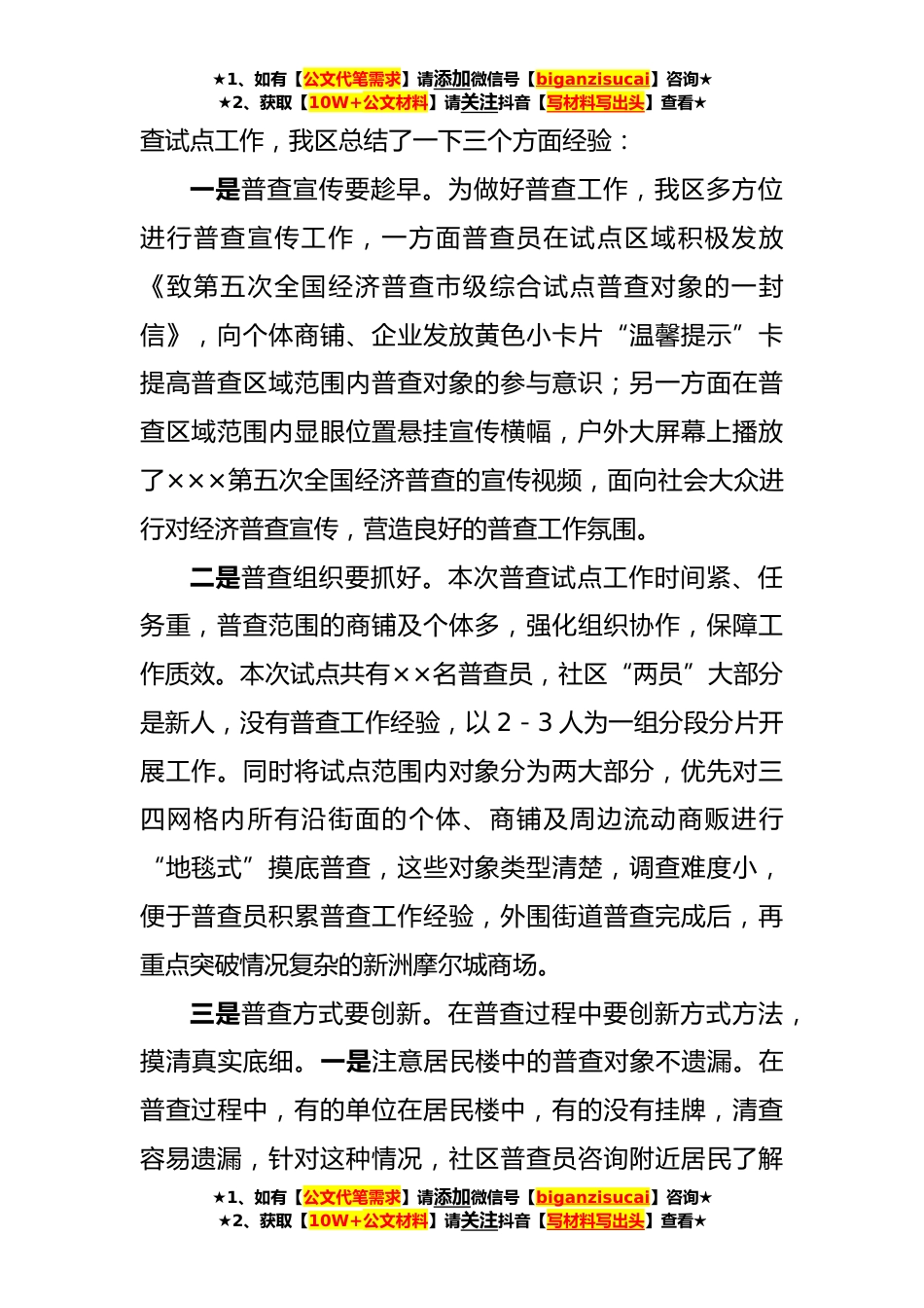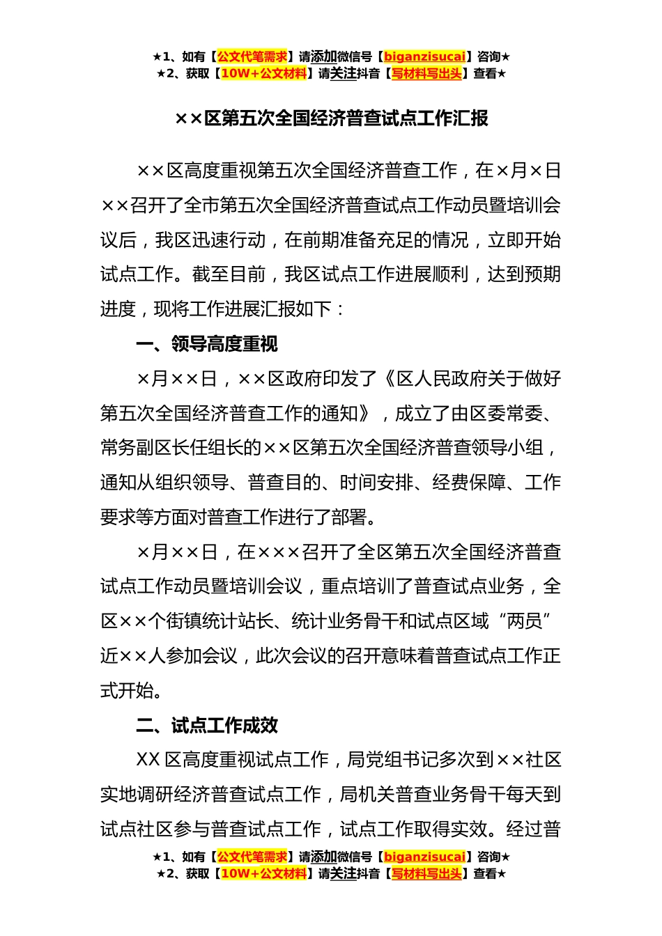 ★1、如有【公文代笔需求】请添加微信号【biganzisucai】咨询★★2、获取【10W+公文材料】请关注抖音【写材料写出头】查看★××区第五次全国经济普查试点工作汇报××区高度重视第五次全国经济普查工作,在×月×日××召开了全市第五次全国经济普查试点工作动员暨培训会议后,我区迅速行动,在前期准备充足的情况,立即开始试点工作。截至目前,我区试点工作进展顺利,达到预期进度,现将工作进展汇报如下:一、领导高度重视×月××日,××区政府印发了《区人民政府关于做好第五次全国经济普查工作的通知》,成立了由区委常委、常务副区长任组长的××区第五次全国经济普查领导小组,通知从组织领导、普查目的、时间安排、经费保障、工作要求等方面对普查工作进行了部署。×月××日,在×××召开了全区第五...