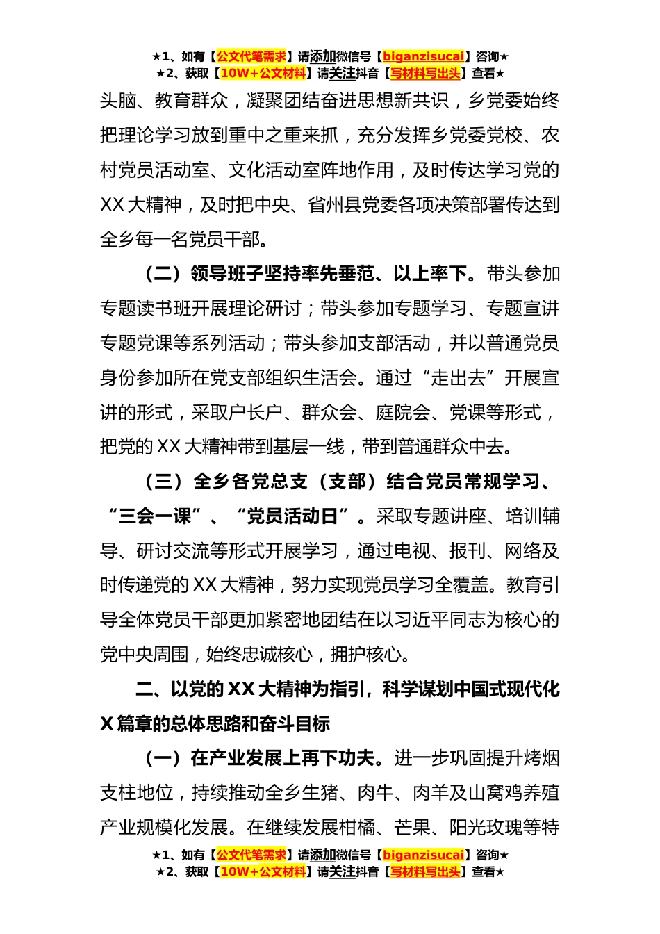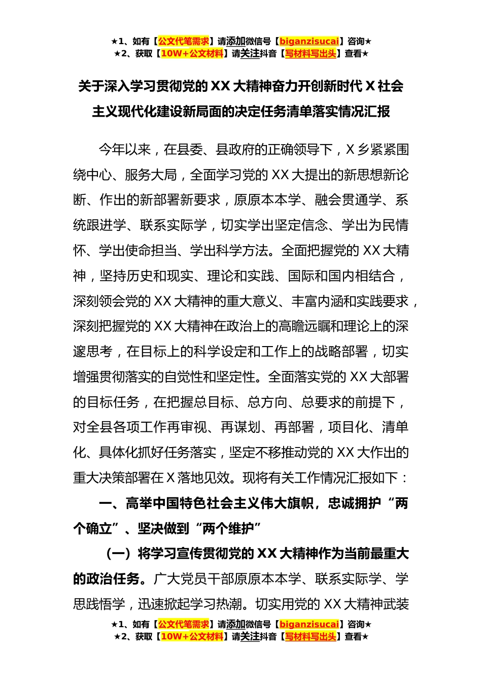 ★1、如有【公文代笔需求】请添加微信号【biganzisucai】咨询★★2、获取【10W+公文材料】请关注抖音【写材料写出头】查看★关于深入学习贯彻党的XX大精神奋力开创新时代X社会主义现代化建设新局面的决定任务清单落实情况汇报今年以来,在县委、县政府的正确领导下,X乡紧紧围绕中心、服务大局,全面学习党的XX大提出的新思想新论断、作出的新部署新要求,原原本本学、融会贯通学、系统跟进学、联系实际学,切实学出坚定信念、学出为民情怀、学出使命担当、学出科学方法。全面把握党的XX大精神,坚持历史和现实、理论和实践、国际和国内相结合,深刻领会党的XX大精神的重大意义、丰富内涵和实践要求,深刻把握党的XX大精神在政治上的高瞻远瞩和理论上的深邃思考,在目标上的科学设定和工作上的战略部署,切实增强...