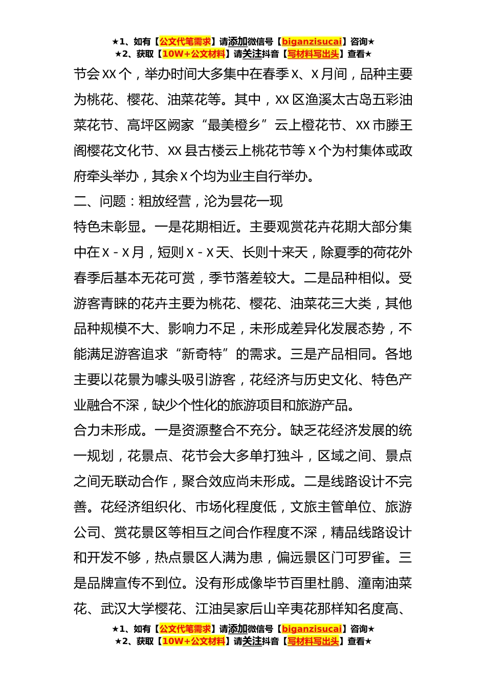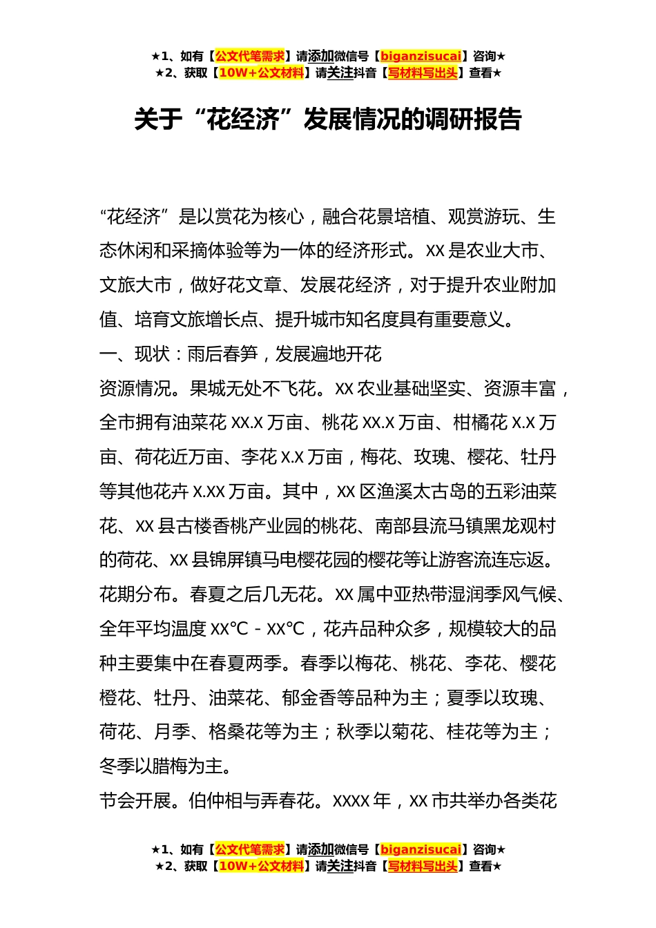 ★1、如有【公文代笔需求】请添加微信号【biganzisucai】咨询★★2、获取【10W+公文材料】请关注抖音【写材料写出头】查看★关于“花经济”发展情况的调研报告“花经济”是以赏花为核心,融合花景培植、观赏游玩、生态休闲和采摘体验等为一体的经济形式。XX是农业大市、文旅大市,做好花文章、发展花经济,对于提升农业附加值、培育文旅增长点、提升城市知名度具有重要意义。一、现状:雨后春笋,发展遍地开花资源情况。果城无处不飞花。XX农业基础坚实、资源丰富,全市拥有油菜花XX.X万亩、桃花XX.X万亩、柑橘花X.X万亩、荷花近万亩、李花X.X万亩,梅花、玫瑰、樱花、牡丹等其他花卉X.XX万亩。其中,XX区渔溪太古岛的五彩油菜花、XX县古楼香桃产业园的桃花、南部县流马镇黑龙观村的荷花、XX县锦屏镇马电樱花园的...