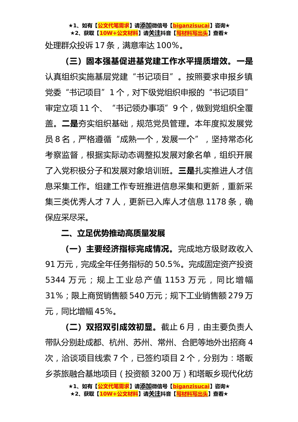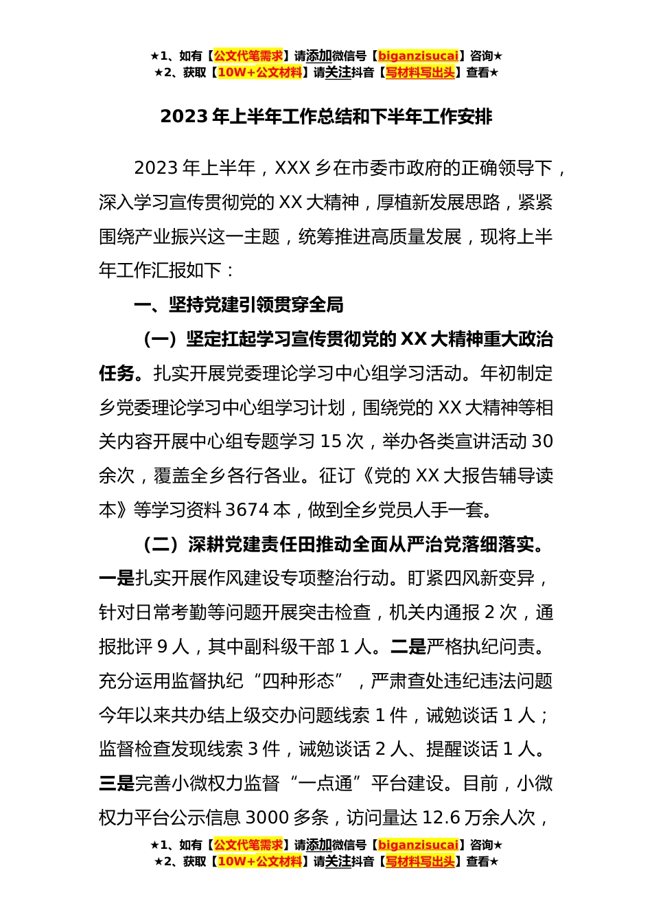 ★1、如有【公文代笔需求】请添加微信号【biganzisucai】咨询★★2、获取【10W+公文材料】请关注抖音【写材料写出头】查看★2023年上半年工作总结和下半年工作安排2023年上半年,XXX乡在市委市政府的正确领导下,深入学习宣传贯彻党的XX大精神,厚植新发展思路,紧紧围绕产业振兴这一主题,统筹推进高质量发展,现将上半年工作汇报如下:一、坚持党建引领贯穿全局(一)坚定扛起学习宣传贯彻党的XX大精神重大政治任务。扎实开展党委理论学习中心组学习活动。年初制定乡党委理论学习中心组学习计划,围绕党的XX大精神等相关内容开展中心组专题学习15次,举办各类宣讲活动30余次,覆盖全乡各行各业。征订《党的XX大报告辅导读本》等学习资料3674本,做到全乡党员人手一套。(二)深耕党建责任田推动全面从严治党落细...