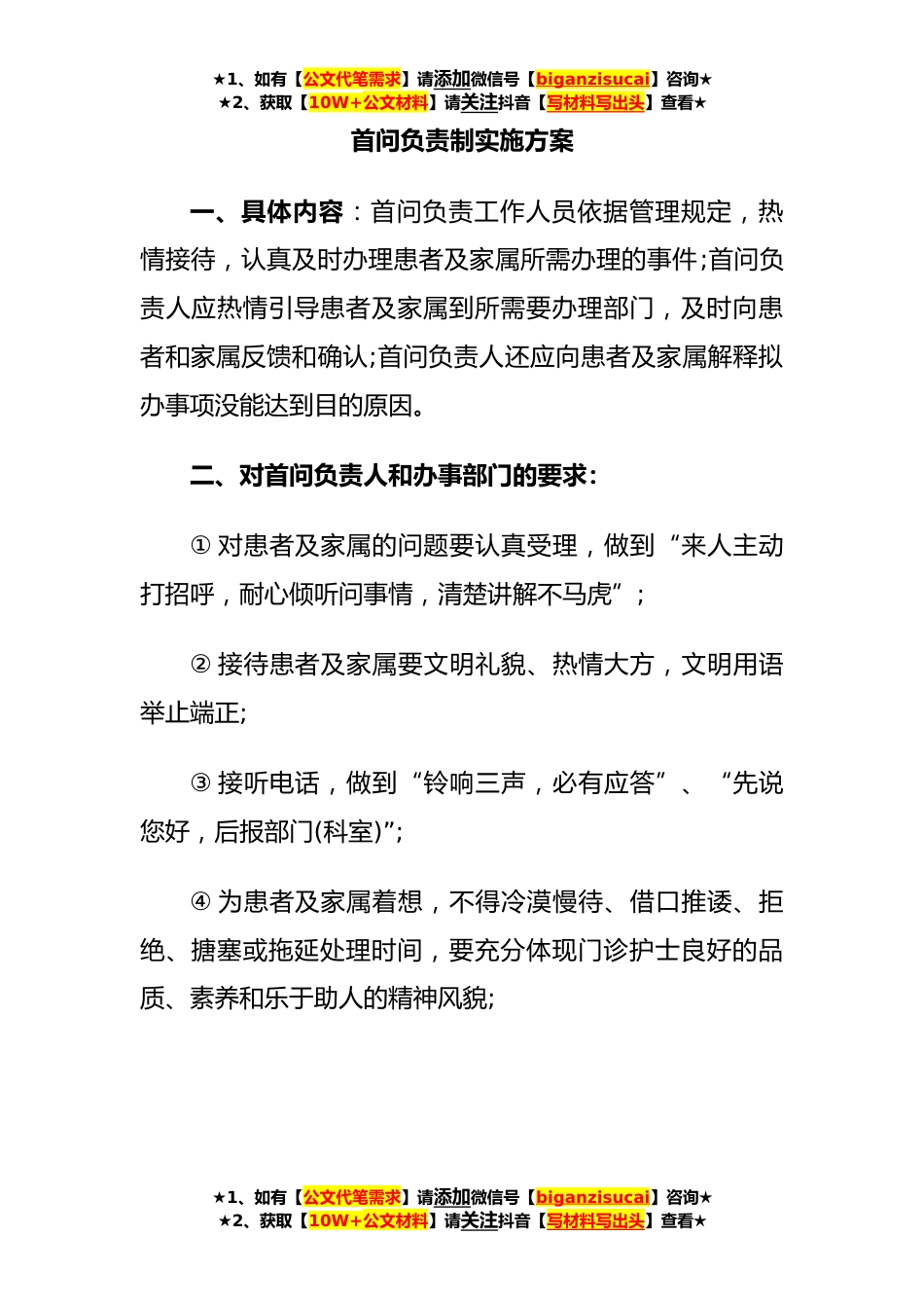 ★1、如有【公文代笔需求】请添加微信号【biganzisucai】咨询★★2、获取【10W+公文材料】请关注抖音【写材料写出头】查看★首问负责制实施方案一、具体内容:首问负责工作人员依据管理规定,热情接待,认真及时办理患者及家属所需办理的事件;首问负责人应热情引导患者及家属到所需要办理部门,及时向患者和家属反馈和确认;首问负责人还应向患者及家属解释拟办事项没能达到目的原因。二、对首问负责人和办事部门的要求:①对患者及家属的问题要认真受理,做到“来人主动打招呼,耐心倾听问事情,清楚讲解不马虎”;②接待患者及家属要文明礼貌、热情大方,文明用语举止端正;③接听电话,做到“铃响三声,必有应答”、“先说您好,后报部门(科室)”;④为患者及家属着想,不得冷漠慢待、借口推诿、拒绝、搪塞或拖延处...
