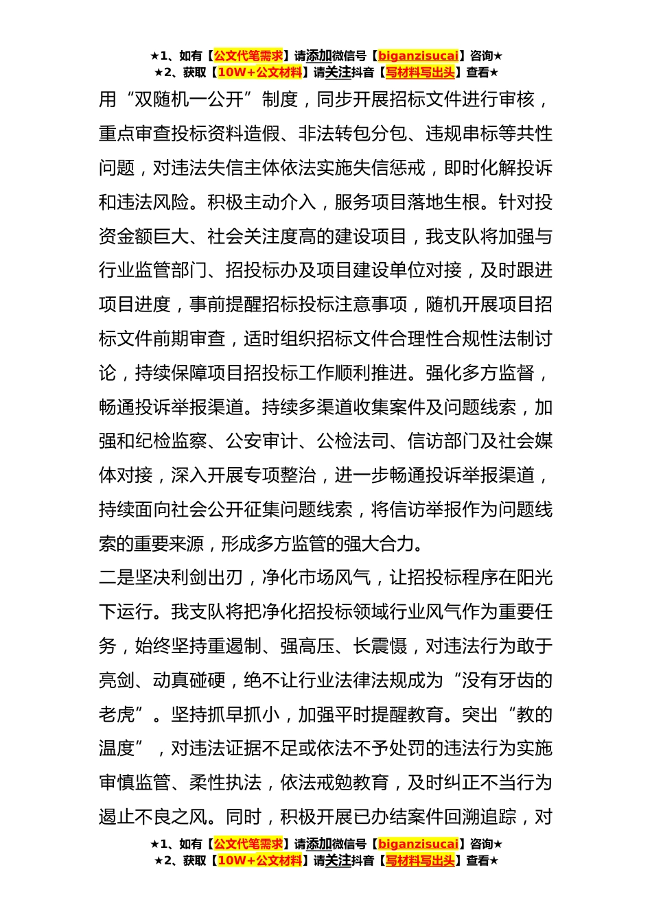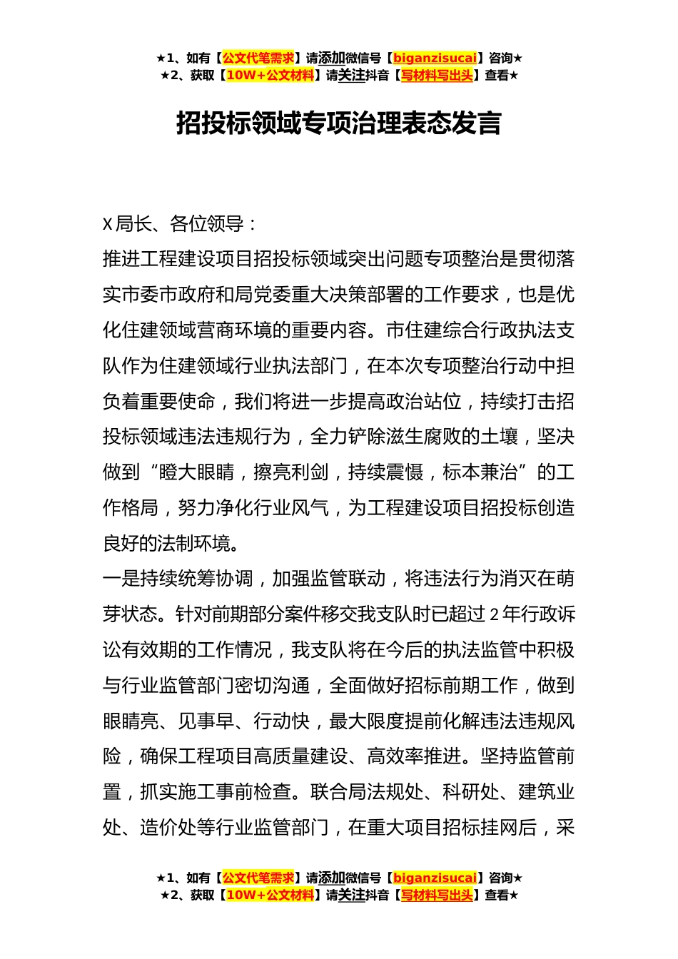 ★1、如有【公文代笔需求】请添加微信号【biganzisucai】咨询★★2、获取【10W+公文材料】请关注抖音【写材料写出头】查看★招投标领域专项治理表态发言X局长、各位领导:推进工程建设项目招投标领域突出问题专项整治是贯彻落实市委市政府和局党委重大决策部署的工作要求,也是优化住建领域营商环境的重要内容。市住建综合行政执法支队作为住建领域行业执法部门,在本次专项整治行动中担负着重要使命,我们将进一步提高政治站位,持续打击招投标领域违法违规行为,全力铲除滋生腐败的土壤,坚决做到“瞪大眼睛,擦亮利剑,持续震慑,标本兼治”的工作格局,努力净化行业风气,为工程建设项目招投标创造良好的法制环境。一是持续统筹协调,加强监管联动,将违法行为消灭在萌芽状态。针对前期部分案件移交我支队时已...