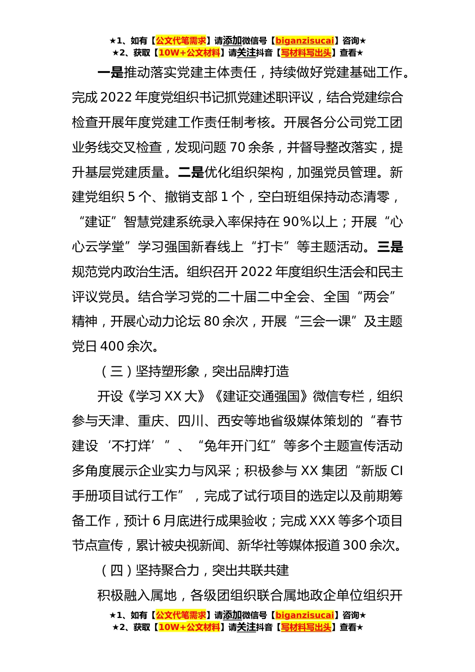 ★1、如有【公文代笔需求】请添加微信号【biganzisucai】咨询★★2、获取【10W+公文材料】请关注抖音【写材料写出头】查看★XX单位2023年上半年工作总结及下半年工作计划2023年上半年,在公司党委的坚强领导下,党建工作部紧紧围绕XX局党委和公司党委年度工作布局,强化政治功能、发挥引领服务作用,结合职能职责统筹推进公司党群建设,有力服务公司高质量发展。一、2023年重点工作开展情况(一)坚持悟思想,突出理论研学坚定不移贯彻落实党的XX大精神,印发学习宣传贯彻党的XX大精神实施方案,并督促落实,按月形成学习宣传贯彻党的“XX大”精神督导工作台账,各基层党支部、公司领导讲授专题党课50余次;以“领导领学+个人自学”方式围绕党的XX大精神进行专题学习研讨,深入学习了习近平总书记系列重要讲话精...