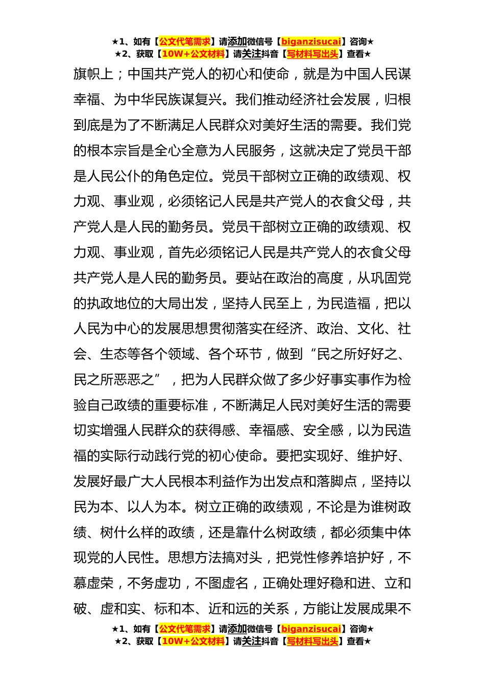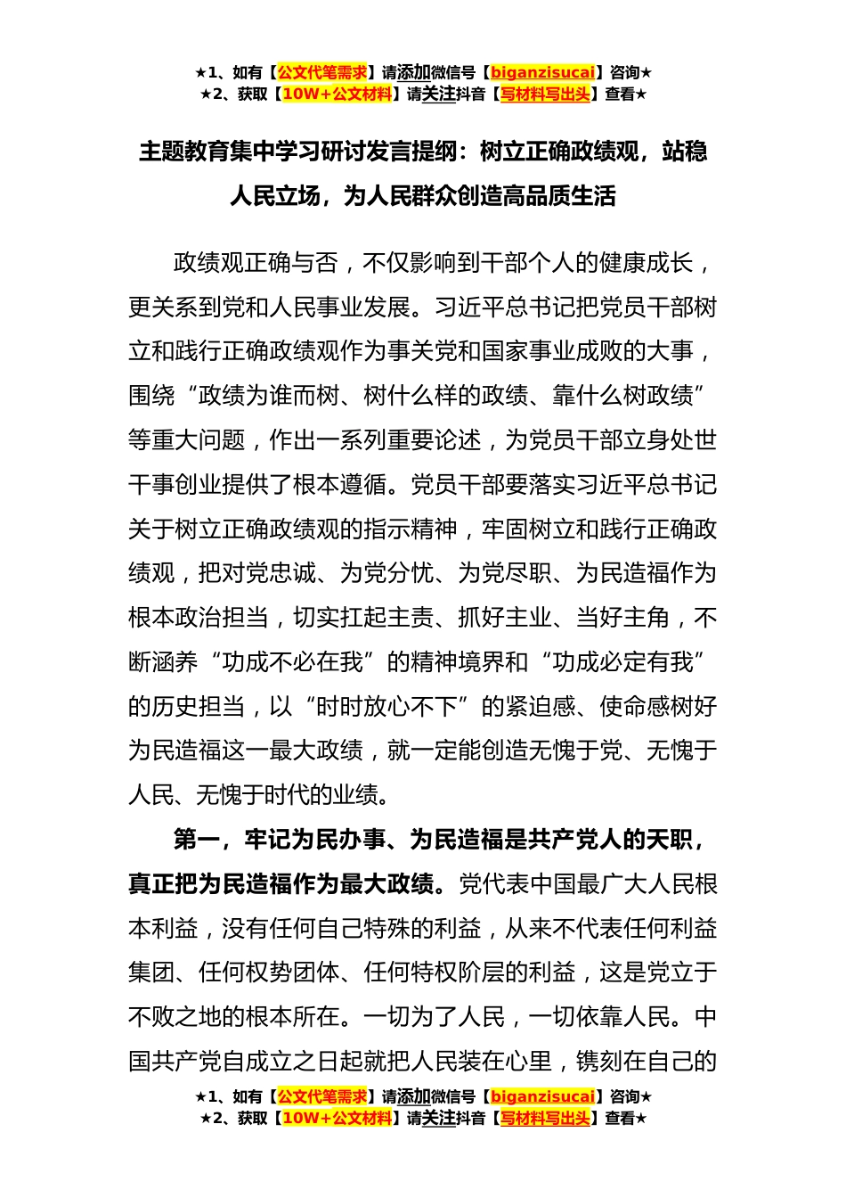 ★1、如有【公文代笔需求】请添加微信号【biganzisucai】咨询★★2、获取【10W+公文材料】请关注抖音【写材料写出头】查看★主题教育集中学习研讨发言提纲:树立正确政绩观,站稳人民立场,为人民群众创造高品质生活政绩观正确与否,不仅影响到干部个人的健康成长,更关系到党和人民事业发展。习近平总书记把党员干部树立和践行正确政绩观作为事关党和国家事业成败的大事,围绕“政绩为谁而树、树什么样的政绩、靠什么树政绩”等重大问题,作出一系列重要论述,为党员干部立身处世干事创业提供了根本遵循。党员干部要落实习近平总书记关于树立正确政绩观的指示精神,牢固树立和践行正确政绩观,把对党忠诚、为党分忧、为党尽职、为民造福作为根本政治担当,切实扛起主责、抓好主业、当好主角,不断涵养“功成不必...