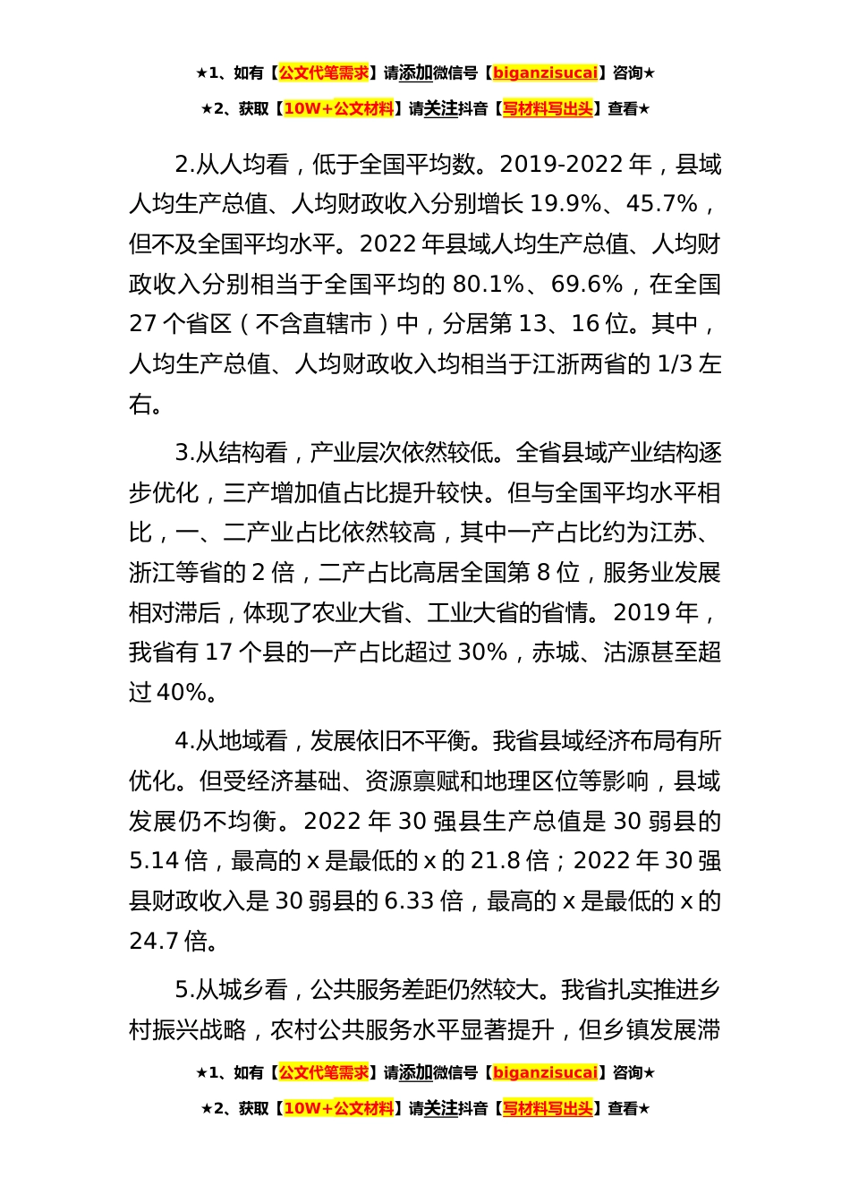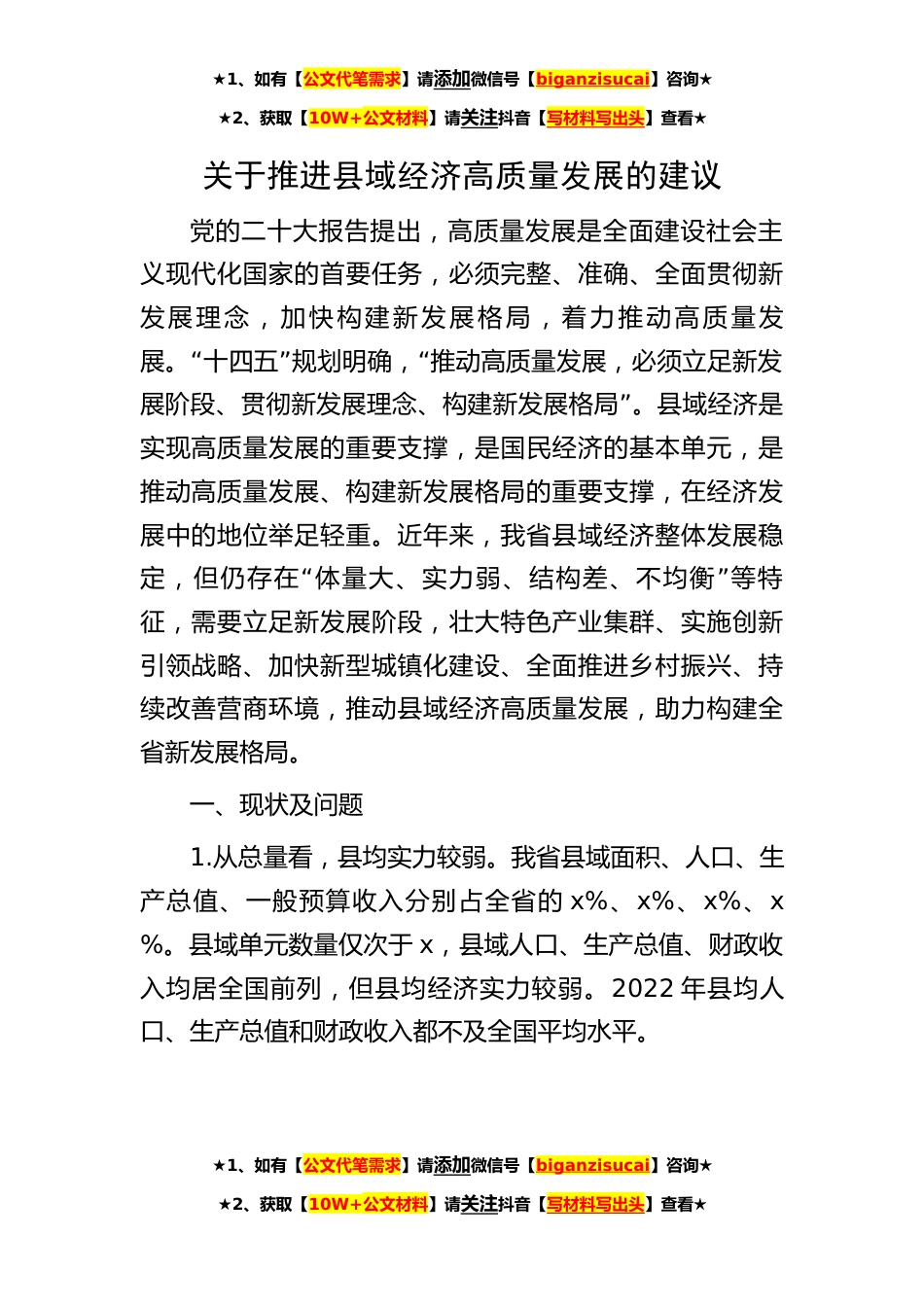 ★1、如有【公文代笔需求】请添加微信号【biganzisucai】咨询★★2、获取【10W+公文材料】请关注抖音【写材料写出头】查看★关于推进县域经济高质量发展的建议党的二十大报告提出,高质量发展是全面建设社会主义现代化国家的首要任务,必须完整、准确、全面贯彻新发展理念,加快构建新发展格局,着力推动高质量发“”“展。十四五规划明确,推动高质量发展,必须立足新发”展阶段、贯彻新发展理念、构建新发展格局。县域经济是实现高质量发展的重要支撑,是国民经济的基本单元,是推动高质量发展、构建新发展格局的重要支撑,在经济发展中的地位举足轻重。近年来,我省县域经济整体发展稳“”定,但仍存在体量大、实力弱、结构差、不均衡等特征,需要立足新发展阶段,壮大特色产业集群、实施创新引领战略、加快新...