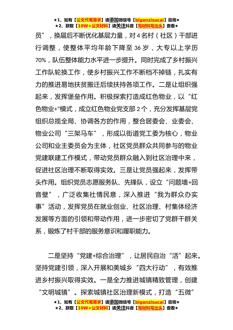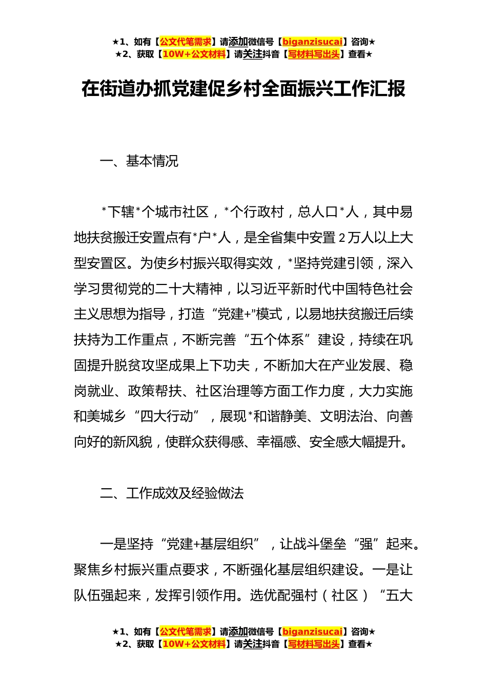 ★1、如有【公文代笔需求】请添加微信号【biganzisucai】咨询★★2、获取【10W+公文材料】请关注抖音【写材料写出头】查看★在街道办抓党建促乡村全面振兴工作汇报一、基本情况*下辖*个城市社区,*个行政村,总人口*人,其中易地扶贫搬迁安置点有*户*人,是全省集中安置2万人以上大型安置区。为使乡村振兴取得实效,*坚持党建引领,深入学习贯彻党的二十大精神,以习近平新时代中国特色社会主义思想为指导,打造“党建+”模式,以易地扶贫搬迁后续扶持为工作重点,不断完善“五个体系”建设,持续在巩固提升脱贫攻坚成果上下功夫,不断加大在产业发展、稳岗就业、政策帮扶、社区治理等方面工作力度,大力实施和美城乡“四大行动”,展现*和谐静美、文明法治、向善向好的新风貌,使群众获得感、幸福感、安全感大幅...