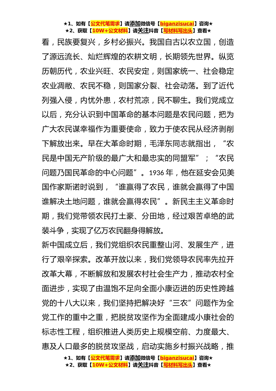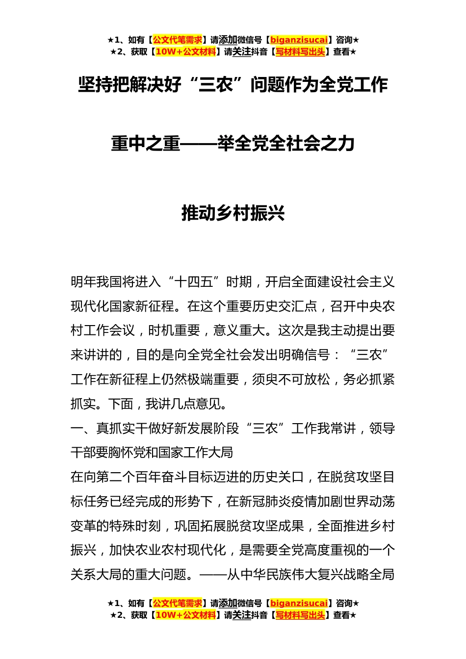 ★1、如有【公文代笔需求】请添加微信号【biganzisucai】咨询★★2、获取【10W+公文材料】请关注抖音【写材料写出头】查看★坚持把解决好“三农”问题作为全党工作重中之重——举全党全社会之力推动乡村振兴明年我国将进入“十四五”时期,开启全面建设社会主义现代化国家新征程。在这个重要历史交汇点,召开中央农村工作会议,时机重要,意义重大。这次是我主动提出要来讲讲的,目的是向全党全社会发出明确信号:“三农”工作在新征程上仍然极端重要,须臾不可放松,务必抓紧抓实。下面,我讲几点意见。一、真抓实干做好新发展阶段“三农”工作我常讲,领导干部要胸怀党和国家工作大局在向第二个百年奋斗目标迈进的历史关口,在脱贫攻坚目标任务已经完成的形势下,在新冠肺炎疫情加剧世界动荡变革的特殊时刻,巩...