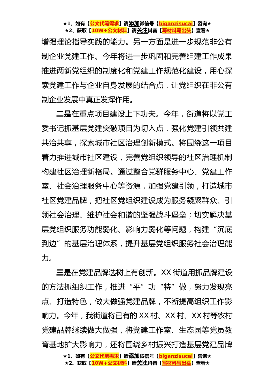 ★1、如有【公文代笔需求】请添加微信号【biganzisucai】咨询★★2、获取【10W+公文材料】请关注抖音【写材料写出头】查看★XX街道(乡镇)组织工作务虚研讨会发言材料2023年,在县委县政府的正确领导下,在县委组织部的指导下,XX街道克服各项困难、自我加压,圆满完成村“两委”换届工作,能够做好农村基层党建、组织、人事编制、老干部、统战等各项工作,推动我街道各项工作任务再上新台阶。2023年,XX街道将深入贯彻落实省市组织部长会议精神和市县党代会精神,以起步就是冲刺、开局就是决战的战斗姿态,谋划思路、补齐短板、打造品牌创先争优,现将工作基本思路汇报如下:一、XX街道2023年工作思路一是在基层党组织建设上见成效。习近平总书记强调,要固化强基固本的思想,扎实做好抓基层、打基础的工作提升...