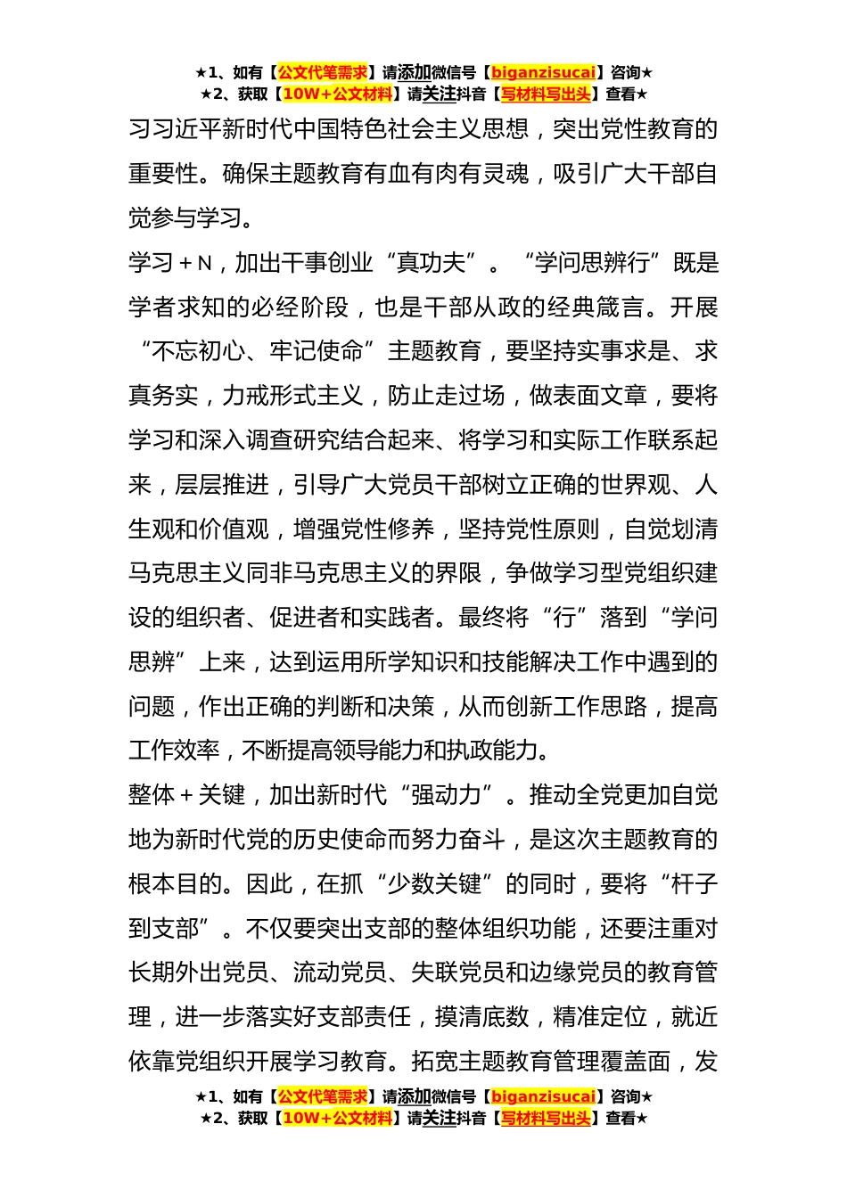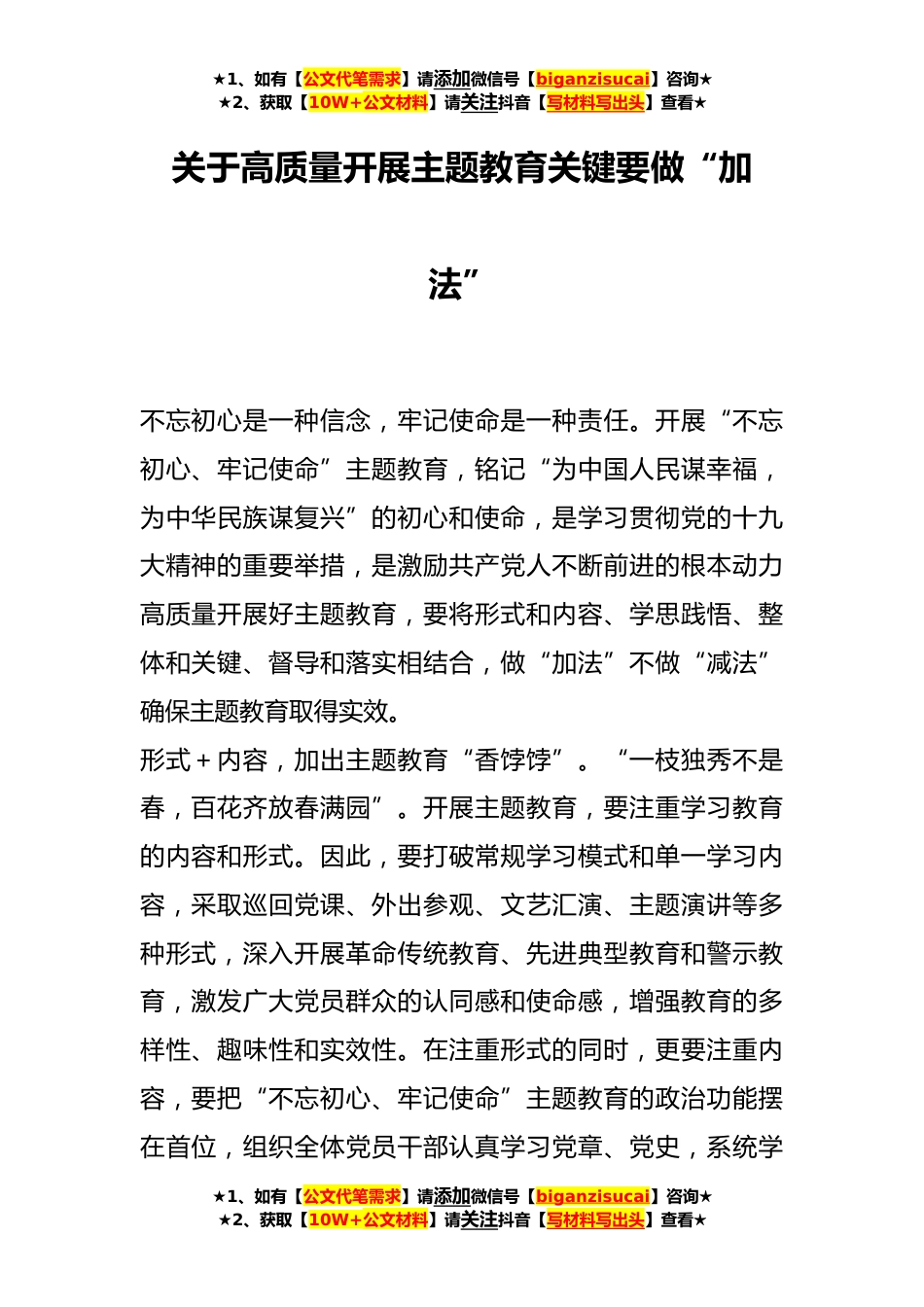 ★1、如有【公文代笔需求】请添加微信号【biganzisucai】咨询★★2、获取【10W+公文材料】请关注抖音【写材料写出头】查看★关于高质量开展主题教育关键要做“加法”不忘初心是一种信念,牢记使命是一种责任。开展“不忘初心、牢记使命”主题教育,铭记“为中国人民谋幸福,为中华民族谋复兴”的初心和使命,是学习贯彻党的十九大精神的重要举措,是激励共产党人不断前进的根本动力高质量开展好主题教育,要将形式和内容、学思践悟、整体和关键、督导和落实相结合,做“加法”不做“减法”确保主题教育取得实效。形式+内容,加出主题教育“香饽饽”。“一枝独秀不是春,百花齐放春满园”。开展主题教育,要注重学习教育的内容和形式。因此,要打破常规学习模式和单一学习内容,采取巡回党课、外出参观、文艺汇演...