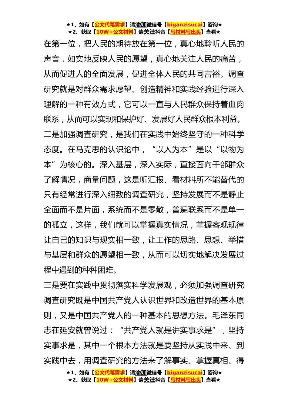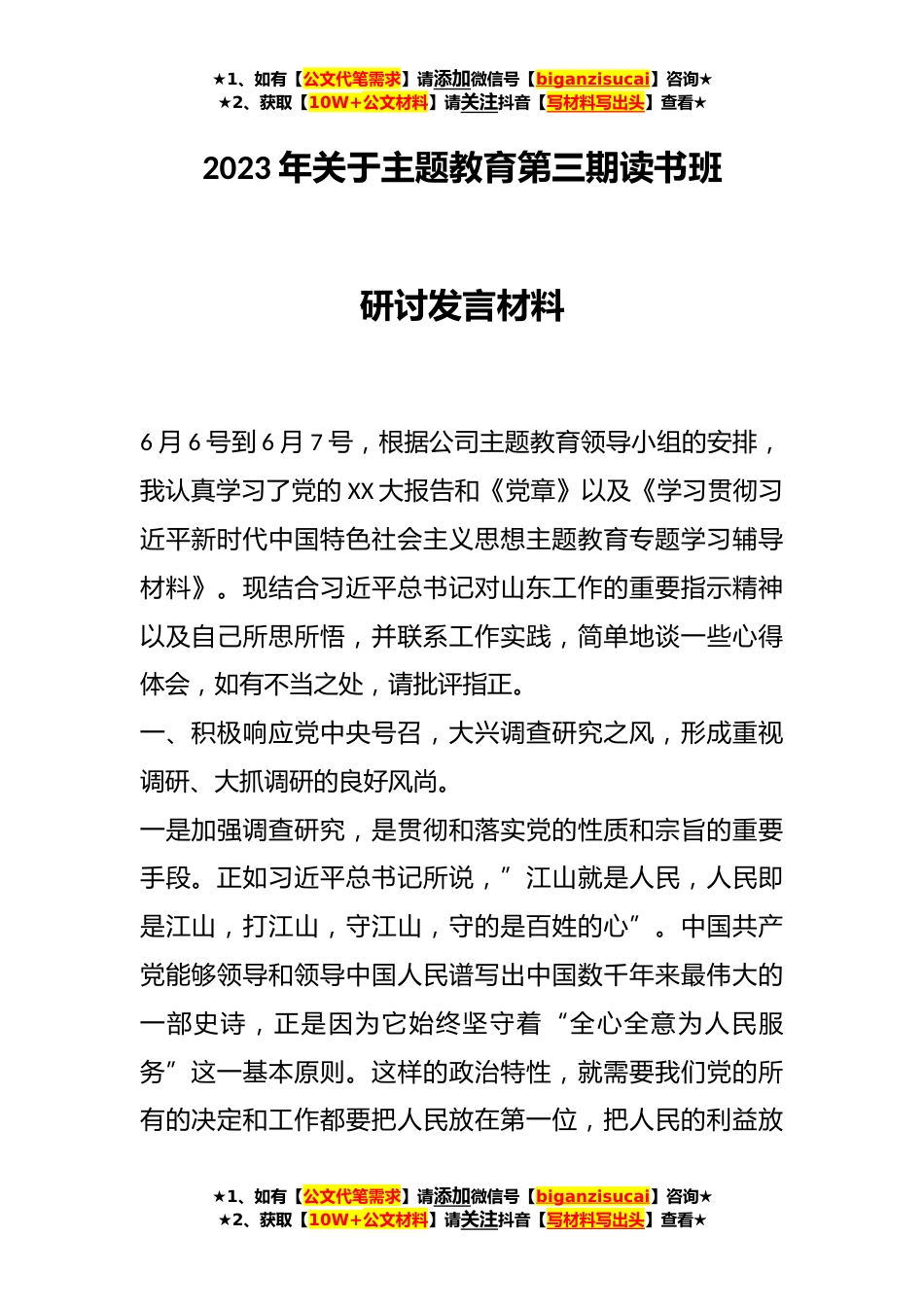 ★1、如有【公文代笔需求】请添加微信号【biganzisucai】咨询★★2、获取【10W+公文材料】请关注抖音【写材料写出头】查看★2023年关于主题教育第三期读书班研讨发言材料6月6号到6月7号,根据公司主题教育领导小组的安排,我认真学习了党的XX大报告和《党章》以及《学习贯彻习近平新时代中国特色社会主义思想主题教育专题学习辅导材料》。现结合习近平总书记对山东工作的重要指示精神以及自己所思所悟,并联系工作实践,简单地谈一些心得体会,如有不当之处,请批评指正。一、积极响应党中央号召,大兴调查研究之风,形成重视调研、大抓调研的良好风尚。一是加强调查研究,是贯彻和落实党的性质和宗旨的重要手段。正如习近平总书记所说,”江山就是人民,人民即是江山,打江山,守江山,守的是百姓的心”。中国共...