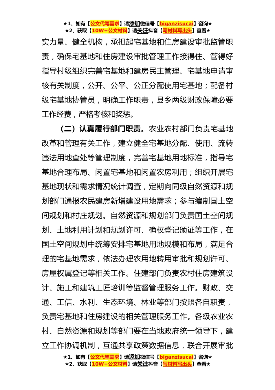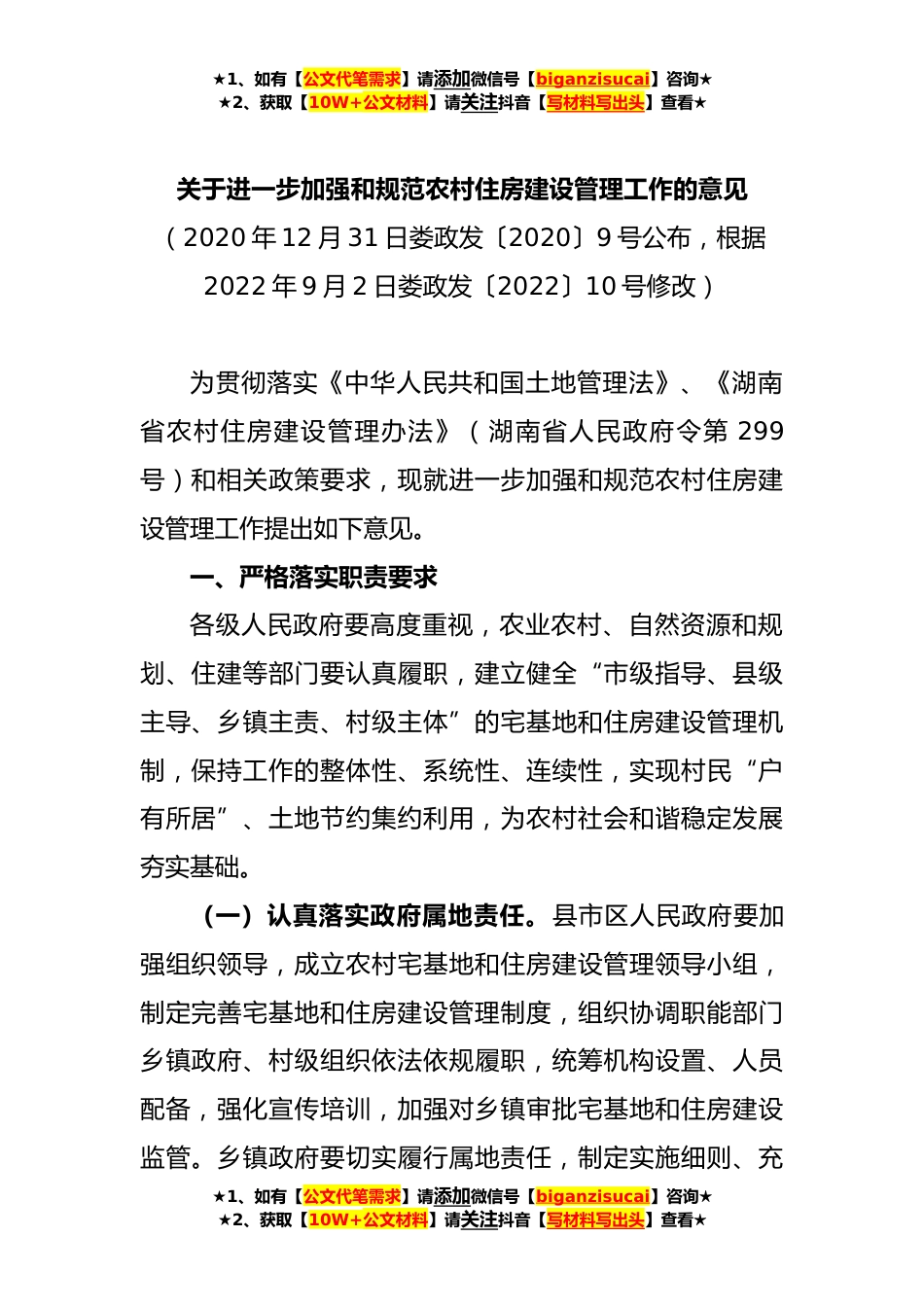 ★1、如有【公文代笔需求】请添加微信号【biganzisucai】咨询★★2、获取【10W+公文材料】请关注抖音【写材料写出头】查看★关于进一步加强和规范农村住房建设管理工作的意见(2020年12月31日娄政发〔2020〕9号公布,根据2022年9月2日娄政发〔2022〕10号修改)为贯彻落实《中华人民共和国土地管理法》、《湖南省农村住房建设管理办法》(湖南省人民政府令第299号)和相关政策要求,现就进一步加强和规范农村住房建设管理工作提出如下意见。一、严格落实职责要求各级人民政府要高度重视,农业农村、自然资源和规划、住建等部门要认真履职,建立健全“市级指导、县级主导、乡镇主责、村级主体”的宅基地和住房建设管理机制,保持工作的整体性、系统性、连续性,实现村民“户有所居”、土地节约集约利用,为农村社会...