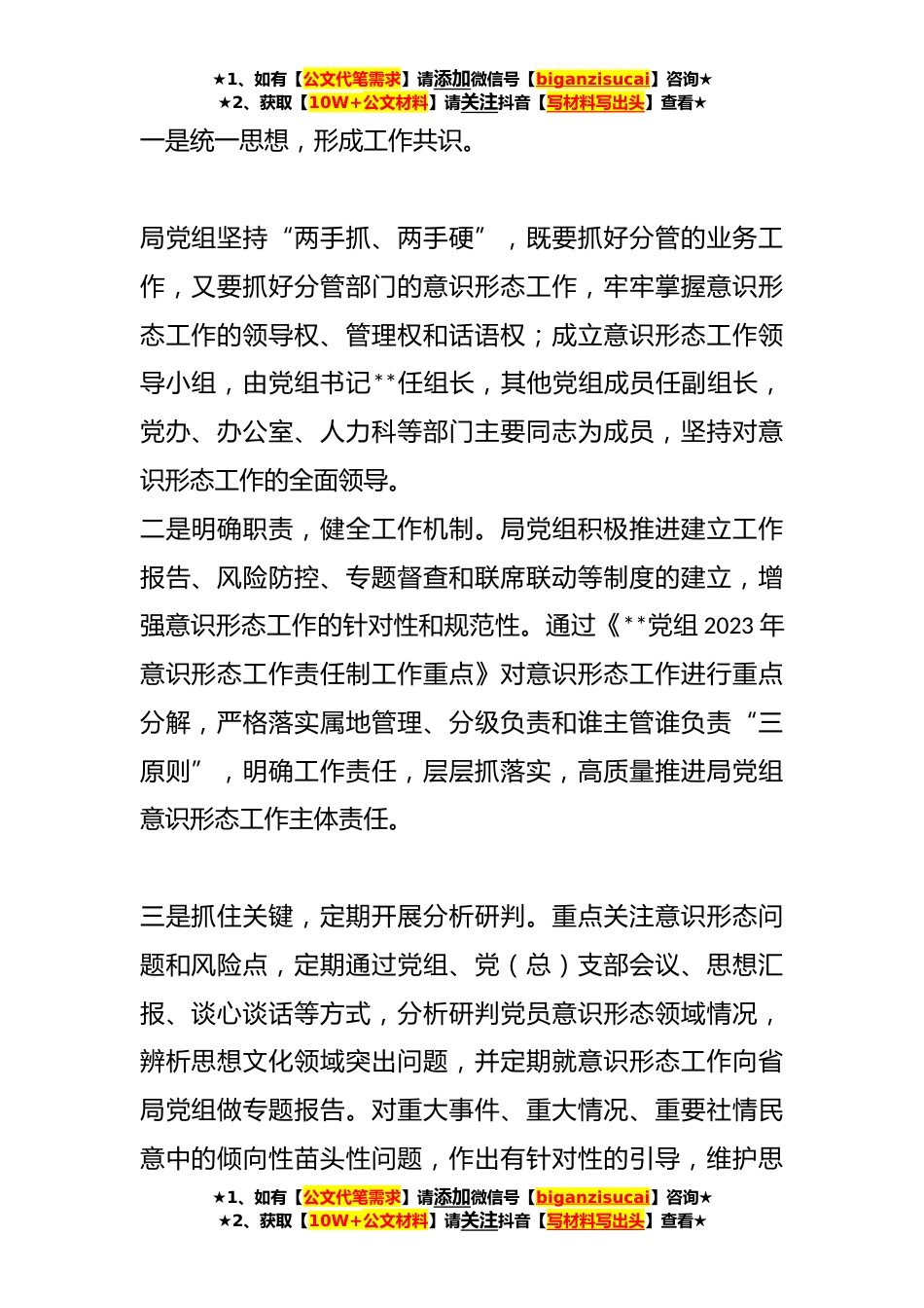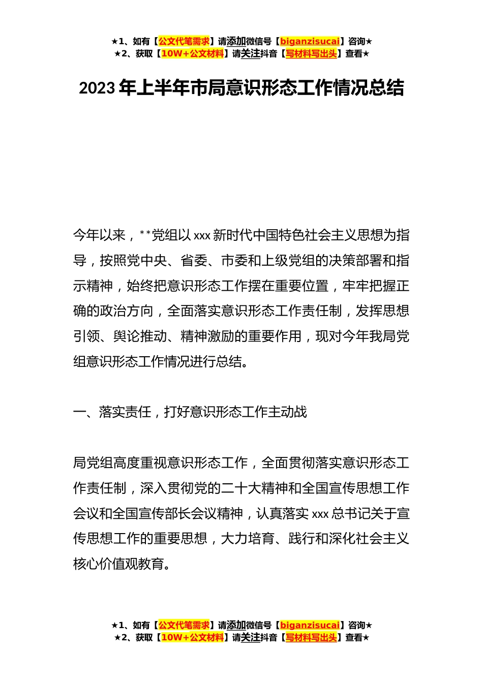 ★1、如有【公文代笔需求】请添加微信号【biganzisucai】咨询★★2、获取【10W+公文材料】请关注抖音【写材料写出头】查看★2023年上半年市局意识形态工作情况总结今年以来,**党组以xxx新时代中国特色社会主义思想为指导,按照党中央、省委、市委和上级党组的决策部署和指示精神,始终把意识形态工作摆在重要位置,牢牢把握正确的政治方向,全面落实意识形态工作责任制,发挥思想引领、舆论推动、精神激励的重要作用,现对今年我局党组意识形态工作情况进行总结。一、落实责任,打好意识形态工作主动战局党组高度重视意识形态工作,全面贯彻落实意识形态工作责任制,深入贯彻党的二十大精神和全国宣传思想工作会议和全国宣传部长会议精神,认真落实xxx总书记关于宣传思想工作的重要思想,大力培育、践行和深化社...