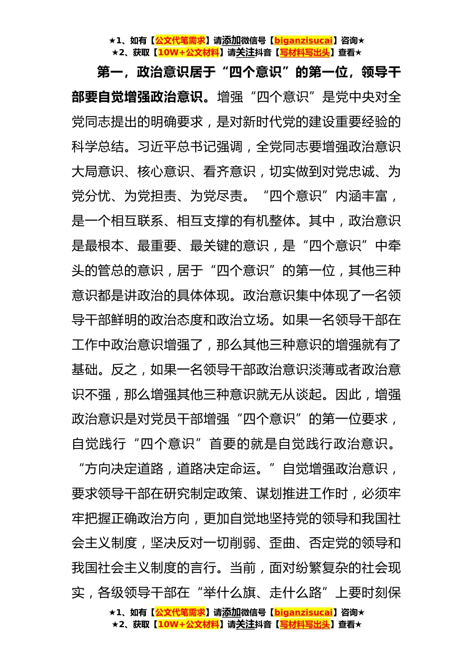 ★1、如有【公文代笔需求】请添加微信号【biganzisucai】咨询★★2、获取【10W+公文材料】请关注抖音【写材料写出头】查看★微党课:领导干部要自觉讲政治同志们:党的二十大报告指出,“全面建设社会主义现代化国家,必须有一支政治过硬、适应新时代要求、具备领导现代化建设能力的干部队伍”“坚持把政治标准放在首位,做深做实干部政治素质考察,突出把好政治关、廉洁关”政治问题,任何时候都是根本性的大问题。毛泽东同志指出,没有正确的政治观点,就等于没有灵魂。邓小平同志指出:“改革,现代化科学技术,加上我们讲政治,威力就大多了。到什么时候都得讲政治。”旗帜鲜明讲政治是我们党作为马克思主义政党的根本要求,关乎党的前途命运、生死存亡。对各级领导干部来讲,旗帜鲜明讲政治是立身之本、从政...